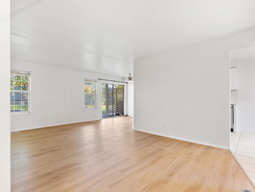 Move-in ready 1-bedroom condo in the popular Wildberry community - complete with attached garage entry, private patio, and access to the pool and clubhouse. The unit features stylish new LVP flooring throughout, a refreshed kitchen with quartz counters, matching backsplash, and a full stainless steel appliance set. Updated lighting, outlets, and switches complement the clean, modern look. The bathroom includes a new vanity, mirror, and light fixture. Functional layout with an eat-in kitchen that opens to the living and dining areas, plus sliding doors leading to a patio overlooking trees and open green space. Spacious bedroom with dual closets and direct access to the full bath. Convenient in-unit laundry and plenty of storage. Freshly cleaned and move-in ready. Major mechanicals already done: roof (2023), water heater (2022), A/C (2019), and furnace (2016). Easy access to shopping, schools, and expressways.