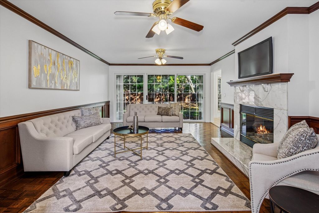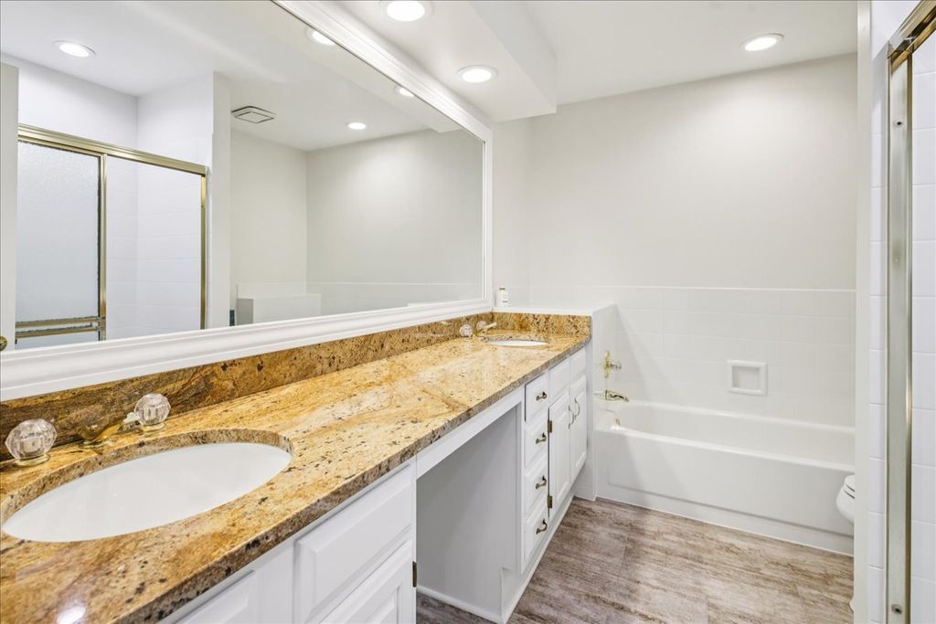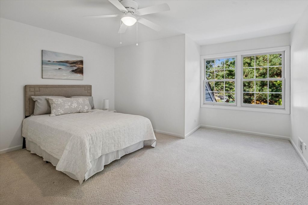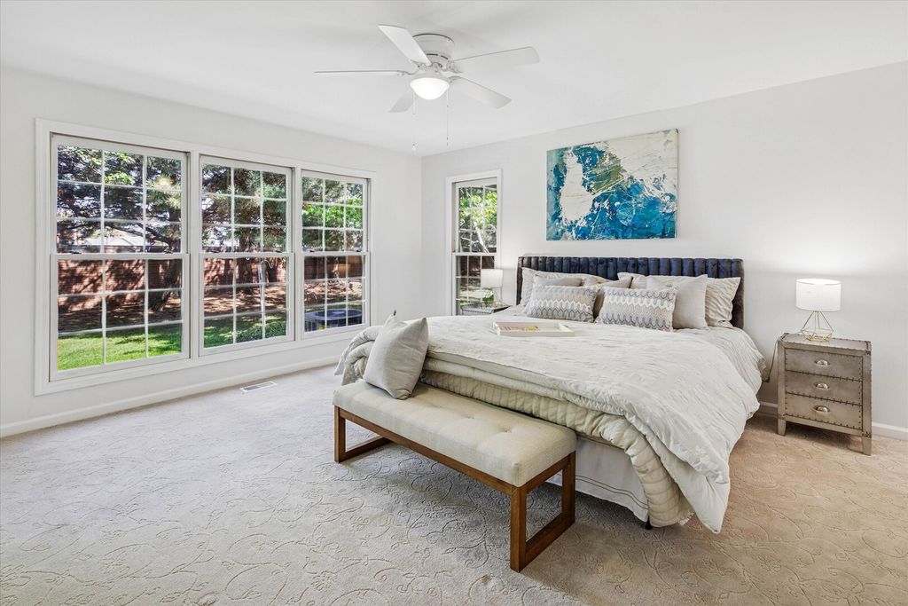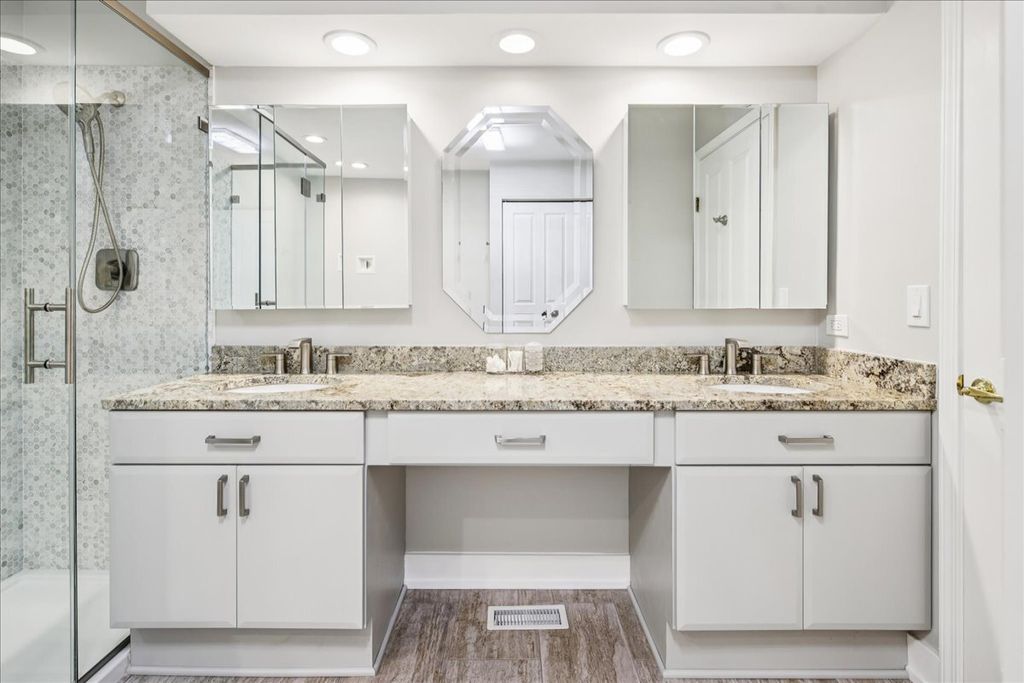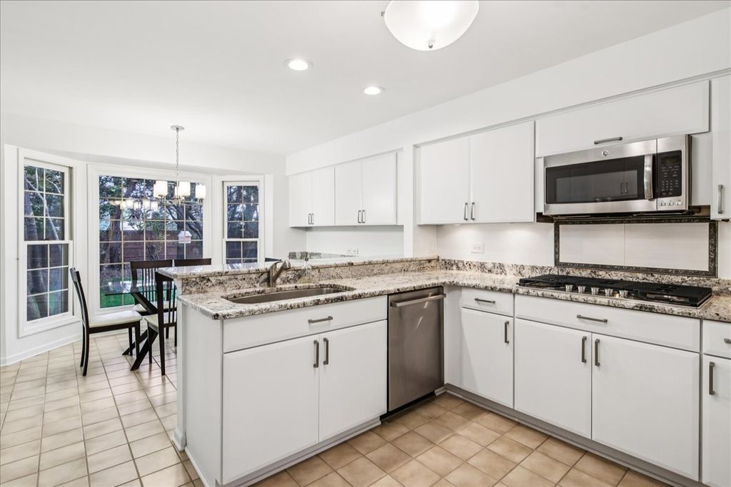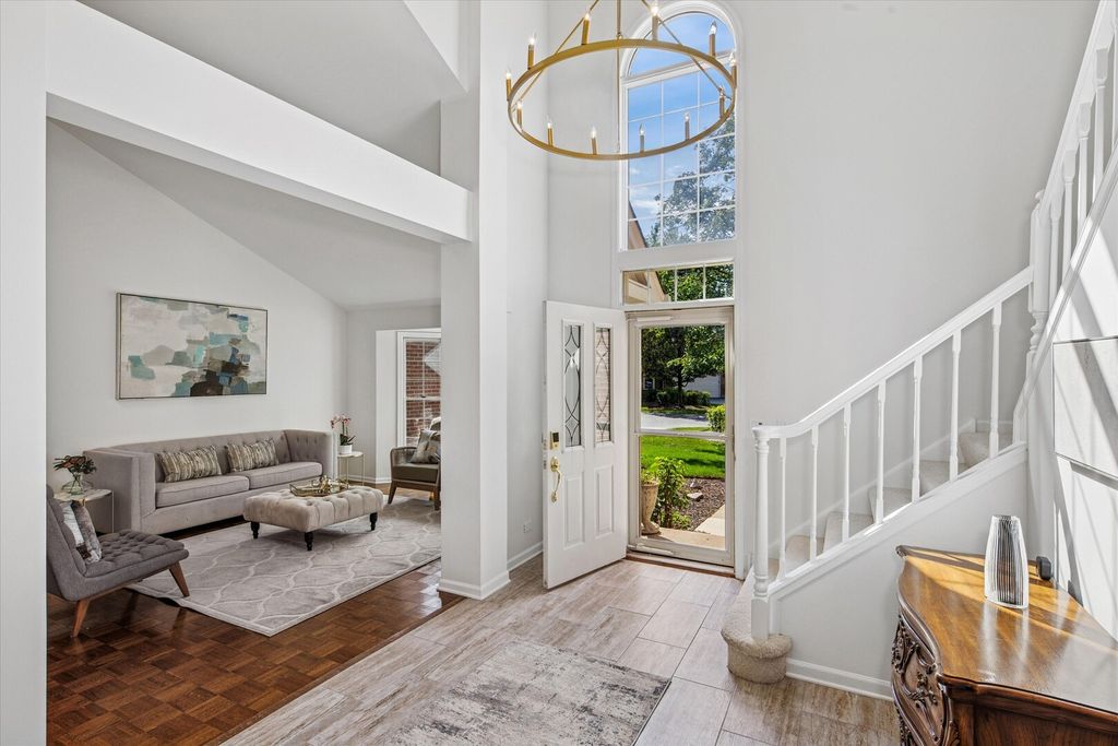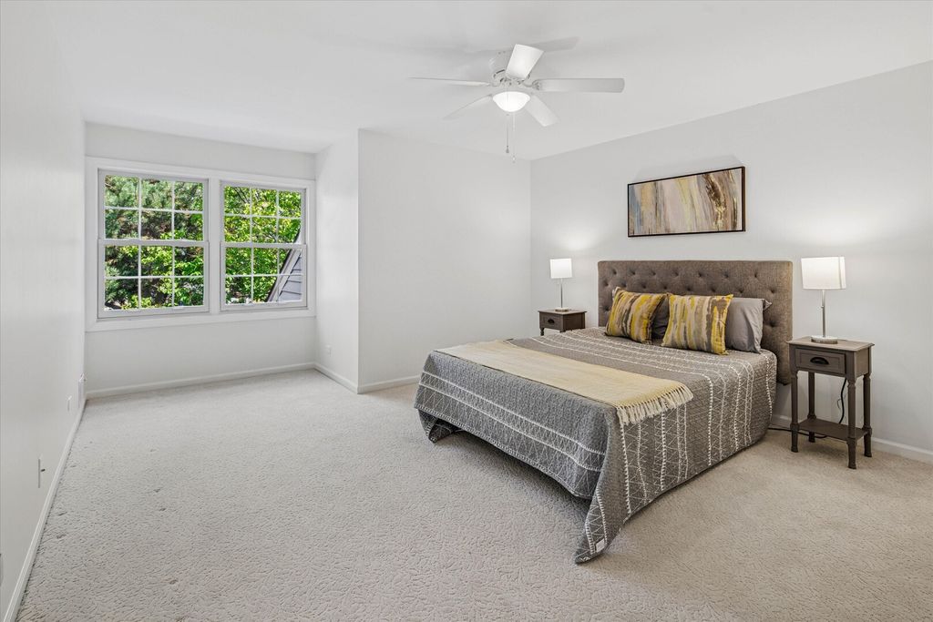 This stunning Covington model townhome in exclusive Princeton Village offers approximately 3,200 square feet of luxurious living space (excluding the garage), and is one of the rare Covington models with a finished basement that includes a spacious fourth bedroom, a full bath with steam shower, a wet bar, and new carpeting. Nestled on a sunny cul-de-sac, this property sits within a prestigious, private, and secured gated community featuring a gated entry with security, lush landscaping, a pool, and clubhouse. The main level is anchored by a grand two-story foyer and a spectacular great room with living and dining areas highlighted by a vaulted cathedral ceiling with skylight window that floods the space with natural light. A massive first-floor primary suite features a brand-new spa-like bathroom with a walk-in shower, soaking tub, Moen faucets, refinished cabinetry, and new lighting. A stylish powder room is also located on the main level. Upstairs, two additional bedrooms each feature new ceiling fans and share a beautifully updated full bath with modern fixtures and lighting. The finished lower level offers the fourth bedroom, a full bath with steam shower, and generous entertaining space with a wet bar and new carpeting. The kitchen has been beautifully updated with refinished cabinetry, new lighting, granite countertops, and a new cooktop with griddle. Appliances including the double oven, refrigerator, and dishwasher were replaced in 2014. A peninsula provides additional prep and seating space. The large laundry room offers new LG washer and dryer with pedestals, a new sink, and cabinetry. Throughout the home you'll find updated lighting, fresh paint, new switches and outlets, a gas log fireplace, and window replacements in both the basement and upstairs. Step outside to enjoy a brick stamped concrete patio, perfect for entertaining, grilling, or dining al fresco while overlooking the expansive shared green space. Additional updates include a new water heater, a new HVAC system with 3.5-ton air conditioner and chiller, a freshly painted garage with epoxy floor (scheduled this month), a new remote thermostat, updated entry locks with remote access, and a newer roof within the past five years. Exterior enhancements also include a new front bay window and front screen door (both scheduled this month). Conveniently located just north of The Glen Town Center with ample shopping, dining, and entertainment, plus access to the top-ranked Glen Club Golf Course. Experience life in prestigious Princeton Village today with this beautifully updated, move-in-ready 4 bedroom, 3.5 bath home.