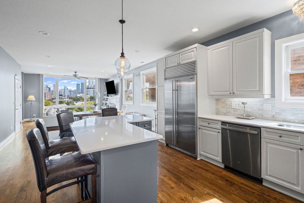 Welcome to 616 N May, Unit 3C - a stunningly updated residence that blends modern design with thoughtful detail in one of Chicago's most vibrant neighborhoods. Inside, you will find an open-concept floor plan with soaring ceilings and oversized windows that fill the space with natural light and striking skyline views. The centerpiece of the home is the chef's kitchen and complementing wet bar, both of which underwent a thorough, thoughtful update with sleek cabinetry, premium finishes, and stainless steel appliances - perfect for both entertaining and everyday living. The primary suite is a true sanctuary. The owners invested over $35,000 in a complete gut renovation of the primary bathroom, professionally designed, transforming it into a spa-inspired retreat with a double vanity, soaking tub, walk-in shower, with floor to ceiling Carrara marble. A spacious walk-in closet, outfitted with California Closet organizers completes this private haven. This home is as much about lifestyle as it is about design. It offers three private outdoor areas, including a main deck that faces the city which delivers sweeping skyline views - the perfect backdrop for summer evenings, weekend gatherings, or a quiet morning coffee. Additional bedrooms provide flexibility for guests, a home office, or fitness space. Convenience is built in with in-unit laundry, ample storage, and garage parking. Situated at the crossroads of West Loop, River West, and Fulton Market, the home places you steps from Chicago's elite dining, shopping, nightlife, and transit options. With its designer upgrades, rare outdoor living, and unbeatable location, 616 N May #3C is a one-of-a-kind opportunity to experience the very best of city living.
