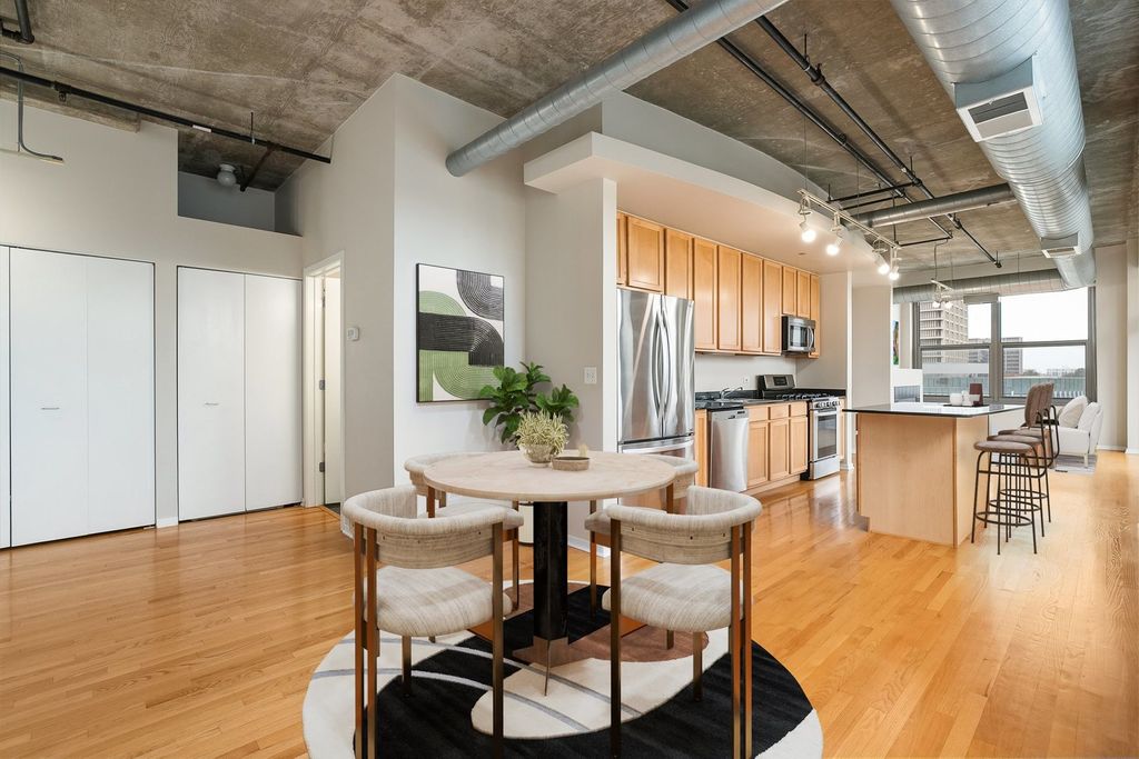 A stunning, light-filled corner unit awaits in a premier mid-rise residence in the heart of the West Loop! Designed for modern living, this condo features an open concept floor plan with high lofted ceilings, gleaming hardwoods and expansive windows that capture the southwest cityscape both day and night. Prepare meals with ease in the spacious kitchen offering 42 inch cabinets, granite counters, stainless steel appliances and a large center island. The adjacent dining area is perfect for hosting special meals with family and friends. Relax or entertain in the living room, anchored by a built-in fireplace, providing a perfect focal point for cozy evenings. At day's end, retreat to the generously-sized primary suite with a walk-in closet and private bath. A second bedroom, hall bath, convenient in-unit laundry and private balcony complete this move-in ready unit. One assigned parking space and storage locker are also included in the sale. Enjoy this full-amenity elevator building with 24-hour front desk/security, fitness center with cardio and weight rooms, business center, package delivery room, bike area, laundry services and a rooftop deck with panoramic city views! Unbeatable location, just blocks from UIC, Rush Hospital, Illinois Medical District, Blue Line, CTA bus line, dog parks, grocery stores, restaurants, expressways and all the West Loop has to offer. This is a pet friendly and investor friendly building! Book your tour today!