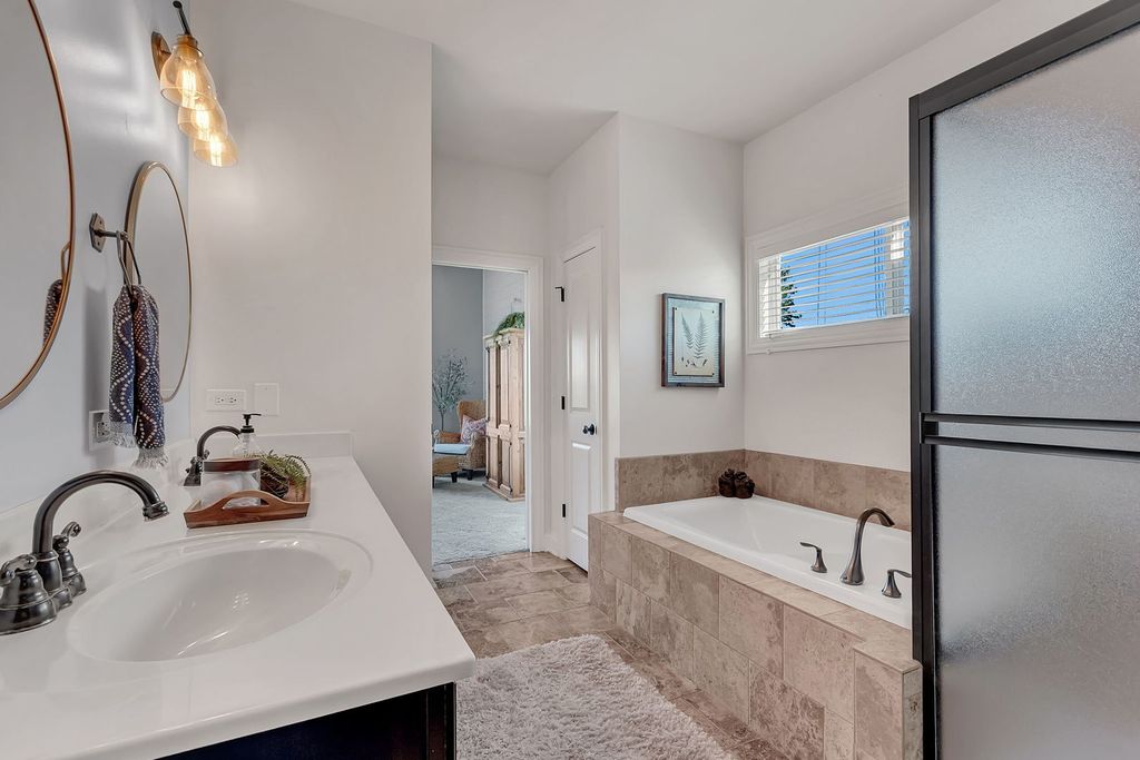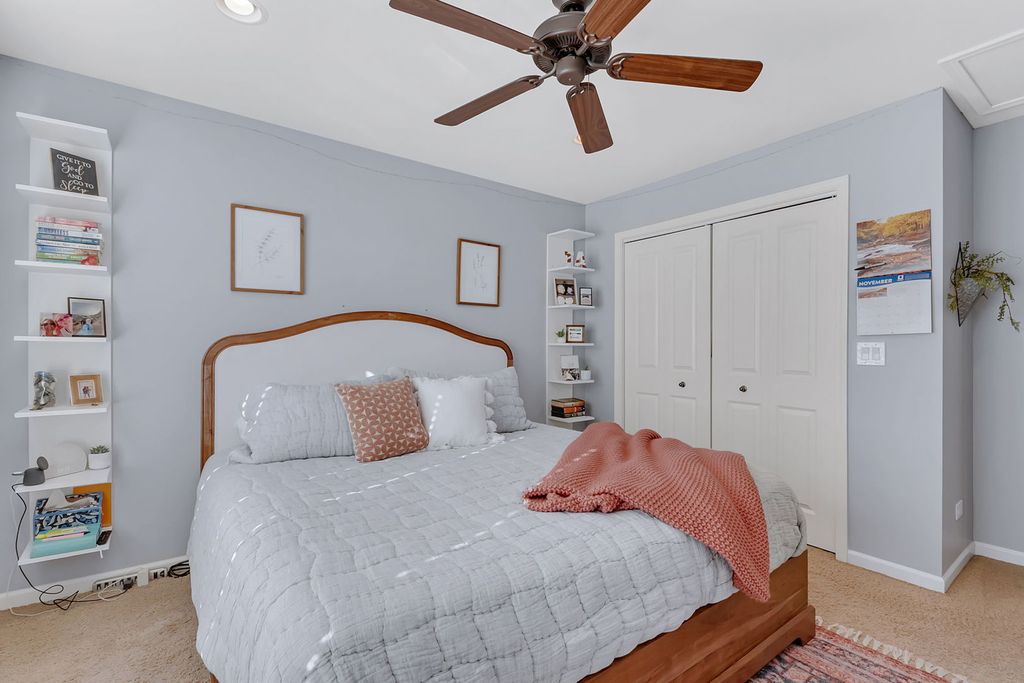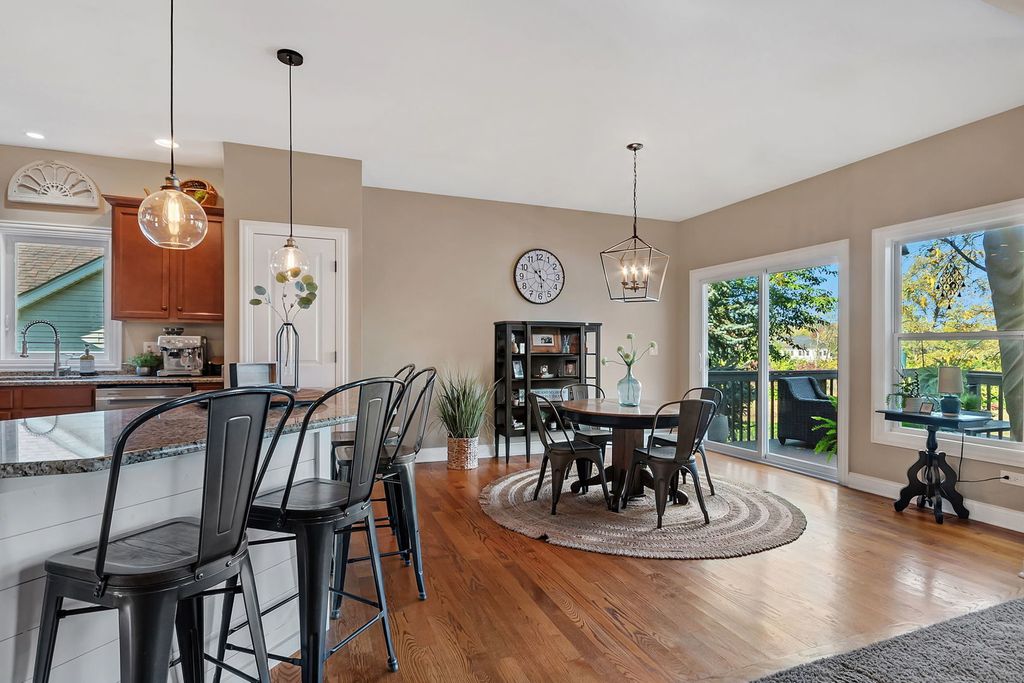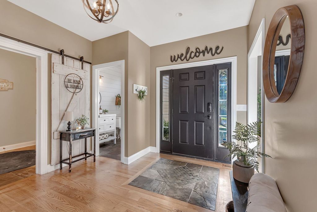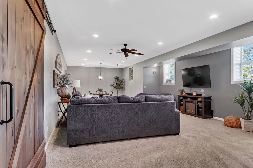 Welcome to this stunning 4-bedroom, 3.1-bathroom home with an open floor plan, main floor master suite, and breathtaking pond views! The main floor master suite offers serene water views and features a shiplap accent wall, spacious walk-in closet, and a luxurious bath with double sinks, soaking tub, and separate shower. The heart of the home is the impressive family room with soaring two-story ceilings, a beautiful brick fireplace, and floor-to-ceiling windows framing picturesque pond views. The kitchen is perfect for entertaining with a breakfast bar, abundant counter space, and a light-filled breakfast room that opens to the upper deck, an the ideal spot to enjoy your morning coffee overlooking the water. Upstairs, you'll find two additional generous bedrooms and a full bath with a tub/shower combination separated from the double sinks with a pocket door. The 9' pour look-out lower level expands your living space with a 4th bedroom, 3rd full bath, large recreation area, gaming and exercise spaces, and plenty of storage. The exercise room is set up to add a wet bar. Watch throughout for the additional shiplap accent walls and barn doors! Enjoy outdoor living on one of the subdivisions beautiful ponds. From fishing and paddle boating to relaxing and enjoying the incredible view from either the upper deck or the lower paver patio, with enclosed under deck storage. Don't wait, come see for yourself, this home truly has it all combining comfort, style, and incredible views.
