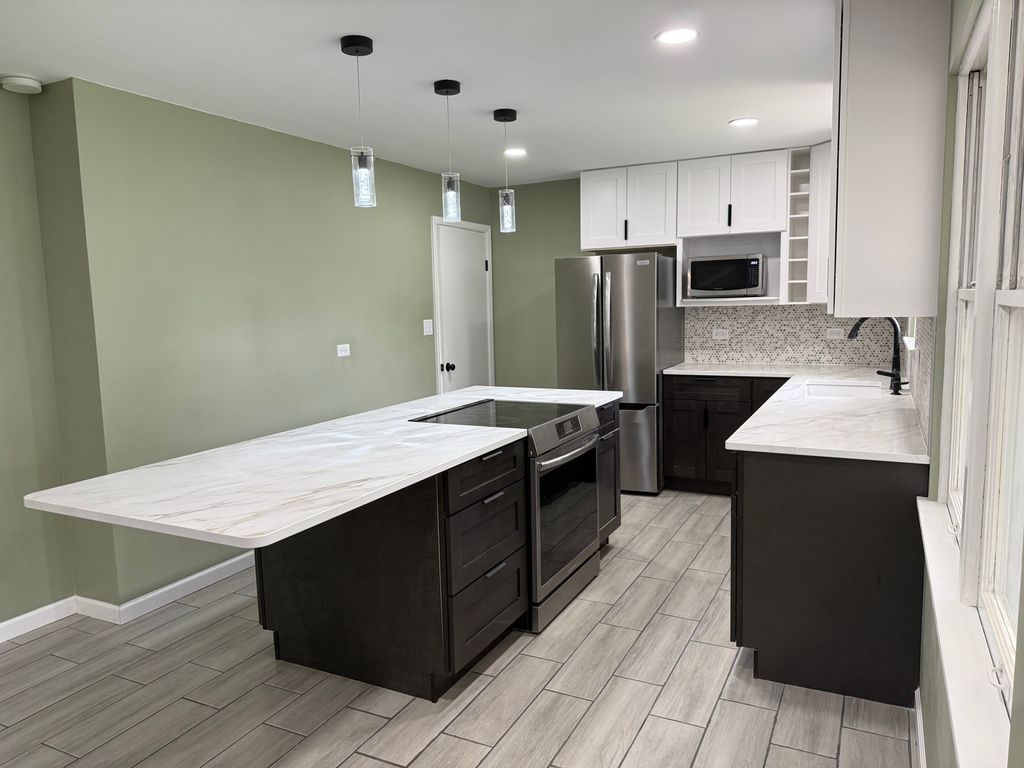 This beautifully remodeled full-brick ranch is located in a well-established neighborhood on Joliet's desirable west side. Offering 4 bedrooms and 2 full baths, this home has been completely updated from top to bottom! Step inside to discover an open-concept layout featuring refinished hardwood floors, recessed LED lighting throughout, and a brand new kitchen with quartz countertops, slow-close cabinets,40" upper cabinets, a modern backsplash, stainless steel appliances, and a spacious island perfect for entertaining. French doors off the dining room lead to a bright 3-season room overlooking the fenced backyard. Both bathrooms are completely updated with stylish ceramic tile flooring and tiled showers. The finished basement adds a large family room-perfect for movie nights, a play area, or game space-plus additional storage and laundry area. Additional upgrades include a brand new roof, new furnace, new hot water heater, updated electrical, and a new garage door. Ample closet space throughout and fresh paint inside and out complete the package. Truly move-in ready-don't miss your chance to own this turnkey home in a fantastic location!