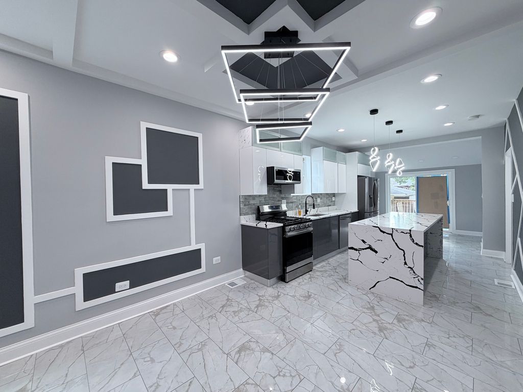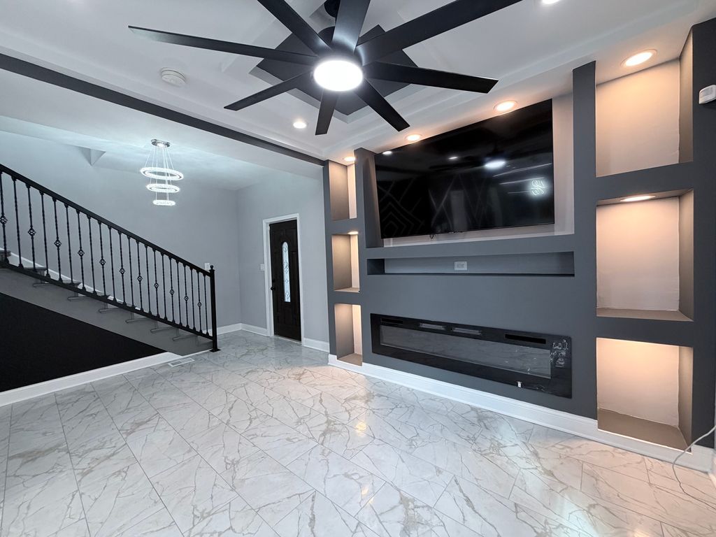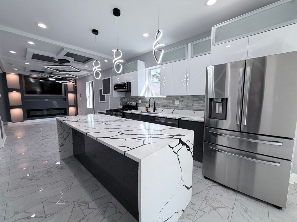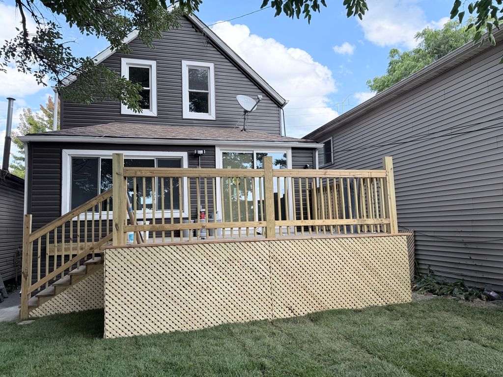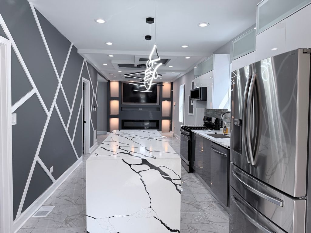 Welcome Home! This beautifully renovated 5-bedroom, 3-bath home perfectly blends modern luxury with everyday comfort. Featuring 3 spacious bedrooms upstairs, 1 on the main floor, and 1 in the finished basement, there's room for everyone to live, work, and relax. You'll fall in love with the modern kitchen-complete with soft-close cabinetry, quartz countertops, porcelain tile flooring, and top-of-the-line Samsung stainless steel appliances. The open-concept living room showcases a sleek electric fireplace and a 75" Samsung flat-screen TV, while the huge family room downstairs features stunning epoxy floors, another electric fireplace, and a 55" Samsung flat-screen TV-perfect for movie nights or entertaining guests. Everything is new inside and out: roof, siding, soffit, fascia, gutters, concrete sidewalk, plumbing, electrical, windows, doors, trim, paint, and flooring. Enjoy comfort and efficiency with a new furnace, central air system, water heater, and high-end washer/dryer combo unit. The porcelain-tiled bathrooms feature sleek modern vanities and finishes. Step outside to your expansive new deck-ideal for entertaining or relaxing outdoors. Located close to restaurants, shopping, and expressway access, this move-in-ready showstopper truly has it all. Don't miss your chance to own this stunning, fully updated home!! Schedule your private showing today!