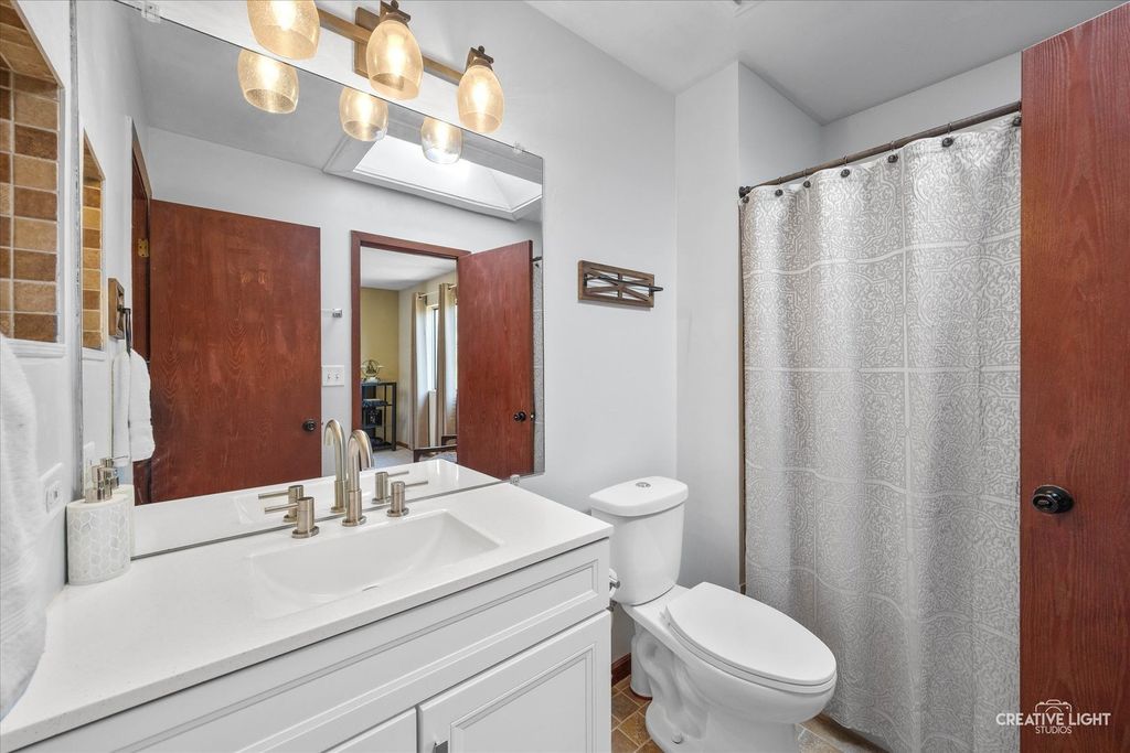 Hurry! This one won't last! Great curb appeal with brick front and full covered front porch! Tile entry! Spacious living room with tons of natural light! Updated kitchen with white cabinetry newer stainless steel appliances, newer countertops and sink, look through into living room and oversized patio door walks out to the private patio with bench seating! Convenient 1st floor laundry! Large family room with custom fireplace could also be a 4th bedroom! Gracious size master bedroom with skylight, large closet and direct access to the full bath with skylight! Excellent oversized spacious bedrooms! Neutral throughout! Deep private lot with shed! Roof and siding replaced approximately 10 years ago! Furnace approximately five years old! Nice interior subdivision location! Close to schools and access to major highways! Beautiful!