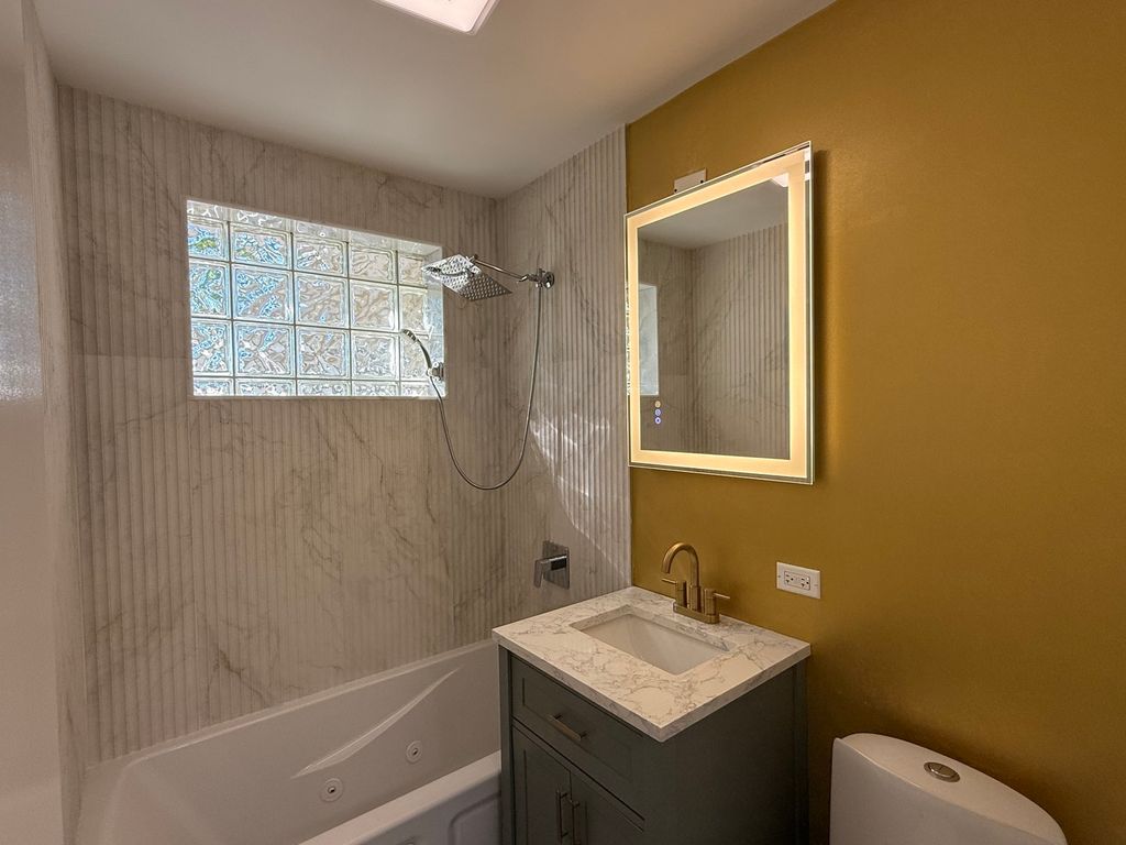 Beautifully Updated Home in Prime Des Plaines Location Welcome to this stunning, fully renovated home on a fantastic block-just a short walk to downtown Deer Plaines, the train, and top-rated schools. This property underwent a gut rehabilitation in 2025, completed with full permits and city inspections. The inviting layout features a spacious living room with large windows that flood the space with natural light. The modern kitchen features Bosch appliances, quartz countertops, and ample space for a dining table. The bedrooms are bright and comfortable, each with built-in closets. The family room serves as a private retreat between the living room and the attached 2.5-car garage, offering two sliding patio doors that open to patios and yards on both sides of the house-perfect for entertaining or relaxing outdoors. The luxurious bathroom includes Italian marble, a Grohe rain shower, and a large whirlpool tub. The family room can easily be converted into an additional bedroom and has room for another bath if desired. The property features a generous front yard and a spacious backyard, ideal for gatherings and play. All mechanicals are new, including a high-efficiency furnace, updated electrical, plumbing, insulation, and a new roof. The entire floors feature herringbone hardwood floors with the option to have them heated. Show with confidence-this home is truly move-in ready. Easy to add another full bath and convert the family room into a primary suite.