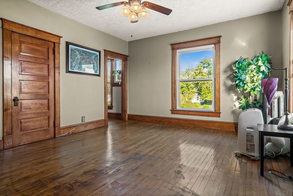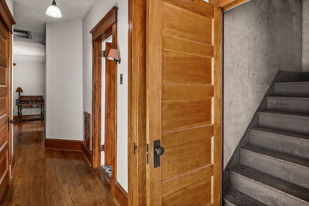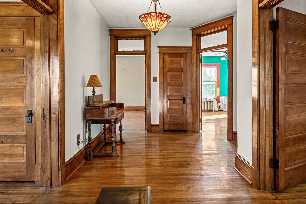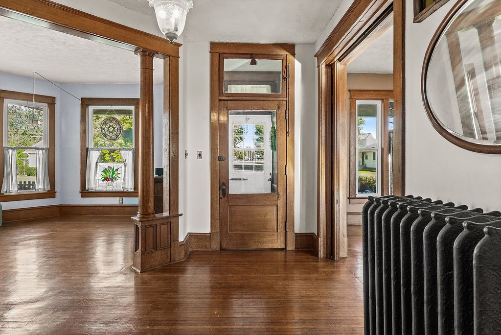 Step back in time without giving up modern comfort in this beautifully preserved and thoughtfully updated 5-bedroom, 2-bath home in the heart of Heyworth. Originally built in 1903 and later moved 13 miles from LeRoy by horses and telephone poles, this remarkable two-story treasure is a living piece of local history, lovingly maintained for over a century. From the moment you step inside, you'll feel the character and craftsmanship that define this home: 10-foot ceilings, original hardwood floors and trim, intricate radiators, transom windows, a built-in hutch, and grand wood pocket doors. A charming working laundry chute, two staircases, and even a few original light fixtures bring warmth and nostalgia throughout. The updated kitchen blends history and function with stainless steel appliances, a large island, newer cabinetry, and a walk-in pantry. French doors lead to a huge 14' x 20' covered back porch. Upstairs, the walk-through primary closet and clawfoot tub add vintage elegance, while the main-floor bath offers a touch of luxury with heated floors. Set on nearly half an acre in a quiet, friendly neighborhood, the yard is a dream, complete with apple and peach trees, mature landscaping, and even a treehouse built in 2024. Enjoy both a covered front porch for morning coffee and a rear porch for evening gatherings. The extra-deep garage provides plenty of storage and workspace. Recent updates bring peace of mind: 2020-2024: Kitchen and pantry remodels, new flooring, bathroom updates, newer appliances, fence and gates, washer, dryer and garbage disposal. 2023: New street, sidewalks, and sewer lines on Karr Street Nest thermostat with Wi-Fi controls for modern efficiency Most windows and boiler believed to have been replaced within the past decade Located just 12 miles from Bloomington, Heyworth offers small-town charm with easy access to city amenities. Home Sold As-Is. Fireplace is As-Is. A truly one-of-a-kind blend of history, character, and comfort. Schedule your private showing today and experience the charm of 111 S. Karr Street for yourself!