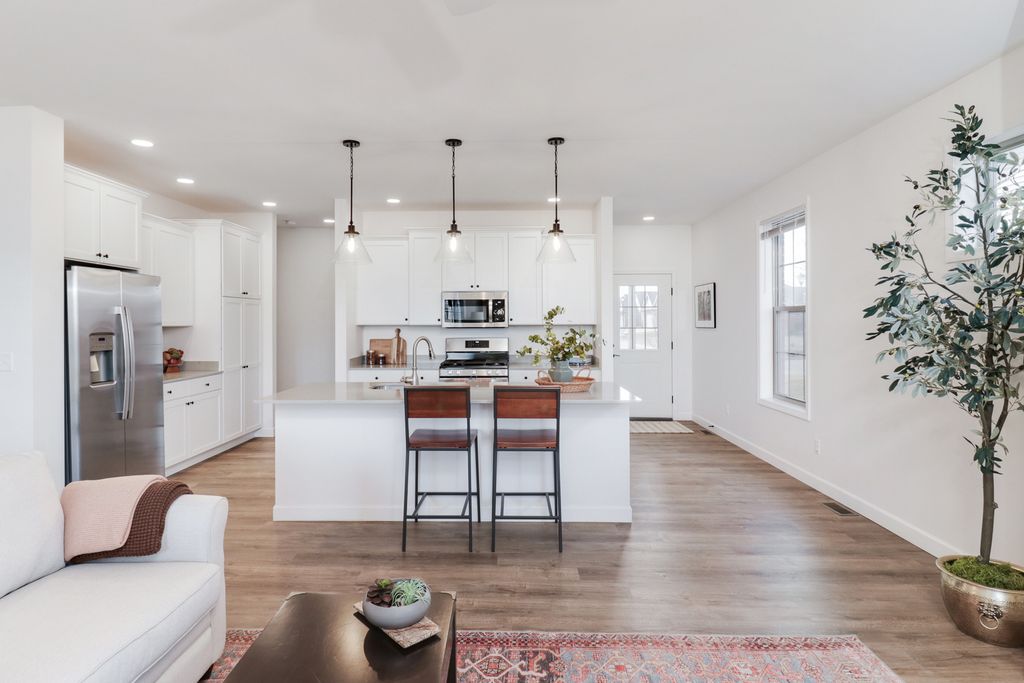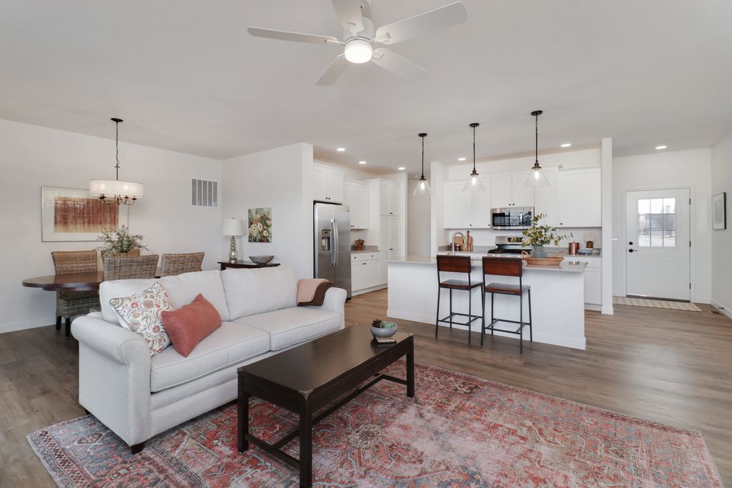 Ready to not shovel snow this winter or mow grass next summer? 1334 Monterey Pine is waiting for you. Evergreen Villas Homeowners Association provides for snow removal, lawn care, and irrigation. Open, well designed floor plan. Kitchen has quartz countertops and white cabinets. Low maintenance flooring of luxury vinyl plank. Pella windows. Basement has rough-in for bath and an egress window for future needs. 18' x 10' covered patio with gas line installed. Extended common area in rear. Freshly painted.