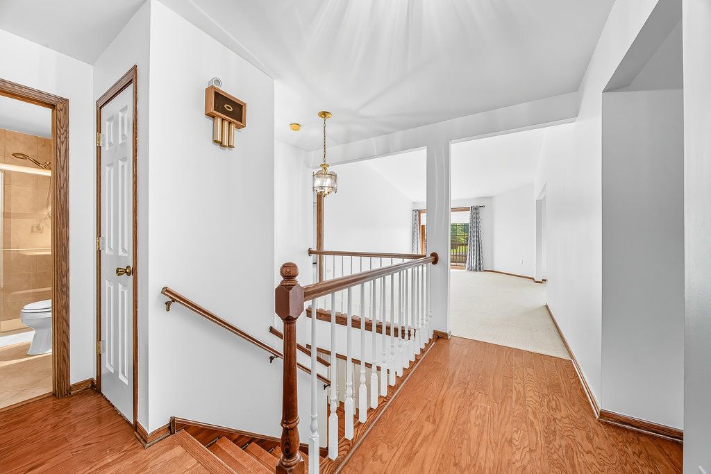 Welcome home to this meticulously maintained, spacious 3BR/3BA ranch where panoramic water views take center stage from an expansive two-tier deck. A bright foyer and soaring ceilings create an airy first impression that flows into a large, sun-splashed living room with sliding doors opening to the deck-perfect for morning coffee or peaceful sunset reflections. The generous primary suite, set apart just off of the living room for privacy, features a luxurious en-suite bath with a new vanity and a large walk-in closet. Just off the entryway, a comfortable second bedroom sits beside a full bath with a step-in shower. The kitchen pairs quartz countertops with a modern backsplash, plentiful cabinetry, and hardwood flooring, while the adjacent dining room sets the scene for effortless entertaining. Thoughtfully placed, plentiful windows on both levels bathe the home in natural light and frame serene pond views, and ceiling fans in nearly every room enhance comfort and efficiency. The expansive lower level lives like its own retreat-complete with radiant-heated floors, a third bedroom with walk-in closet, dedicated office, storage and laundry rooms, and a cozy fireplace for those cold winter nights. Outside, the massive two-tier deck invites alfresco dining and easy entertaining while taking in breathtaking sunset views over the pond. A two-car attached garage adds everyday convenience. Roof replacement scheduled for 2025, with the seller paying the special assessment before closing. Close to top schools, parks, restaurants, shopping, and public transportation. This one just feels like home! Schedule your private showing today..