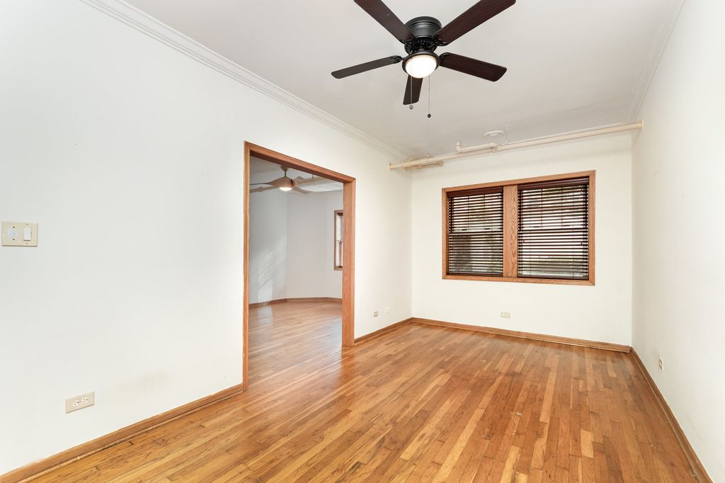 This high garden corner unit offers the perfect blend of vintage charm and modern updates. Just a few steps down from the entry, you're welcomed into a foyer and a large coat closet. Tall windows, and gleaming hardwood floors create a bright, airy feel throughout. A hallway leads past your own in-unit laundry to the open-concept living and dining areas, enhanced by crown moldings and abundant sunlight. The kitchen features quality cabinetry, stainless steel appliances, a dishwasher, and a pantry. Two oversized bedrooms provide flexible living options. The primary easily fits a king-size bed and offers an entire wall of mirrored closet space. The second bedroom, with its huge walk-in closet, is equally bright and was recently used as a den but can effortlessly function as a traditional bedroom again. Located in a well-managed vintage building in the heart of Oak Park, this home sits near parks, shops, restaurants, schools, the pool, and the farmers' market. Enjoy unbeatable access to public transportation, including nearby Green and Blue Line stations, and quick connections to the I-290 Expressway; perfect for an easy downtown commute. Move-in ready and priced to sell, this gem offers exceptional value and location in one of Oak Park's most desirable neighborhoods.