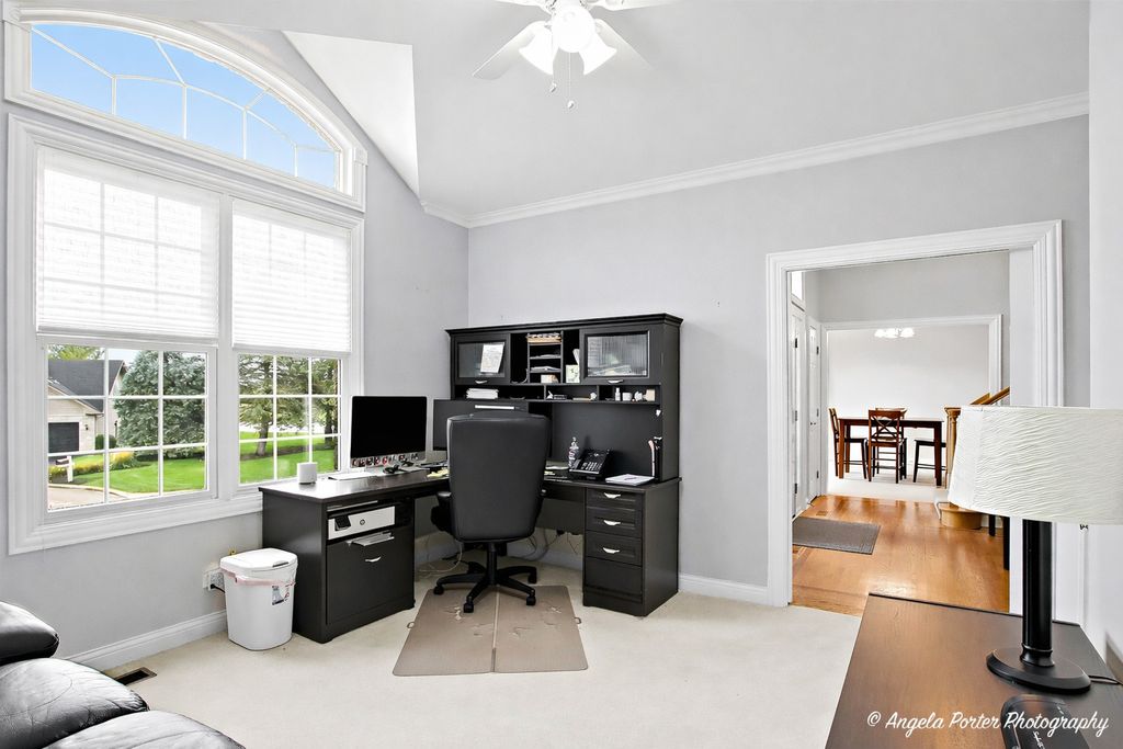 Stunning home in Chalet Hills Estates situated on the 10th hole of Chalet Hills Golf Course! This spacious and well-maintained property sits on over 1/2 acre with beautiful golf course views and is ideally located near the clubhouse, community park, and within a highly rated school district. The flowing floor plan includes a great room with soaring ceilings and a cozy fireplace, a bright open kitchen with 42" cabinets, granite countertops, large island, recessed lighting, walk-in pantry, reverse osmosis system, and breakfast nook with built-in workstation, plus a sunroom leading to a large deck with a retractable Sunsetter awning. A formal dining room, two-story foyer, first-floor master suite with tray ceilings and luxe bath, den/library with custom built-ins, additional bedroom, full bath, laundry room, and hardwood flooring complete the main level, while the upstairs offers a spacious loft, two oversized bedrooms, and another full bath. The partially finished English basement provides a family room with bar, exercise area, den, workshop, bathroom rough-in, and abundant storage. Additional features include a smart thermostat and garage door, roof (2016), A/C (2019), water softener (2014), new well pressure tank, and in-ground irrigation system-truly a perfect blend of comfort, function, and an exceptional location.