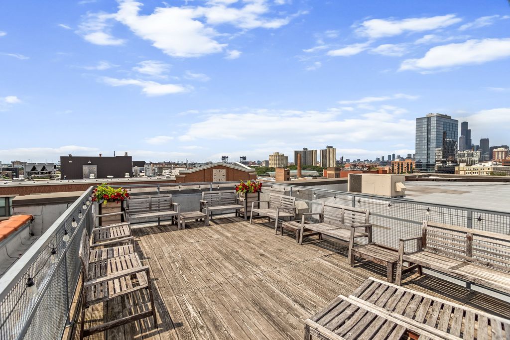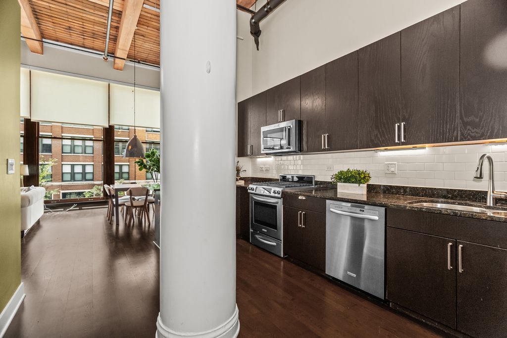HOT, RARELY AVAILABLE MOTOR ROW LOFTS! Live in style at this standout loft in the original Cadillac building in the South Loop! This 1-bedroom + den unit combines historic charm with smart modern upgrades-featuring soaring 16' timber ceilings and a flexible, open layout. A spacious foyer with generous closet space welcomes you into the unit. The kitchen is equipped with granite countertops, high-end stainless steel appliances (including a premium microwave), bar seating, dark modern cabinetry, and crisp white subway tile. Track lighting was updated in 2020, and the kitchen and den received a fresh refresh in July 2025. The open-concept living/dining area is bathed in natural light from floor-to-ceiling windows, complete with custom battery-powered blinds (installed in 2022). The living room features a cozy fireplace, custom built-ins with bar area, and three 14' functional windows-no screens, for a clean, uninterrupted view. The spacious primary bedroom includes a large walk-in closet and a full wall of built-ins. The bathroom offers glass shower doors and a tub/shower combo. The den is perfect for a home office or guest space. Additional upgrades include: Brand new In-Unit front-loading washer & dryer (2025), tucked behind a charming sliding farmhouse door for style and space-saving. HVAC replaced in December 2023, with a 5-year transferrable warranty. Entire unit painted in 2023 for a fresh, modern look. Enjoy city views from the rooftop deck. Premium first-floor deeded parking space (additional $25,000) in the attached heated garage. You'll also have tall cage storage, access to a bike room, and extra building storage. Investor-friendly and pet-friendly, with no rental restrictions. HOA includes: water, garbage, internet, cable, garage and elevator maintenance. Located just two blocks from the Green Line and minutes from downtown, lakefront paths, coffee shops, breweries, and expressways-this is a rare gem you don't want to miss!