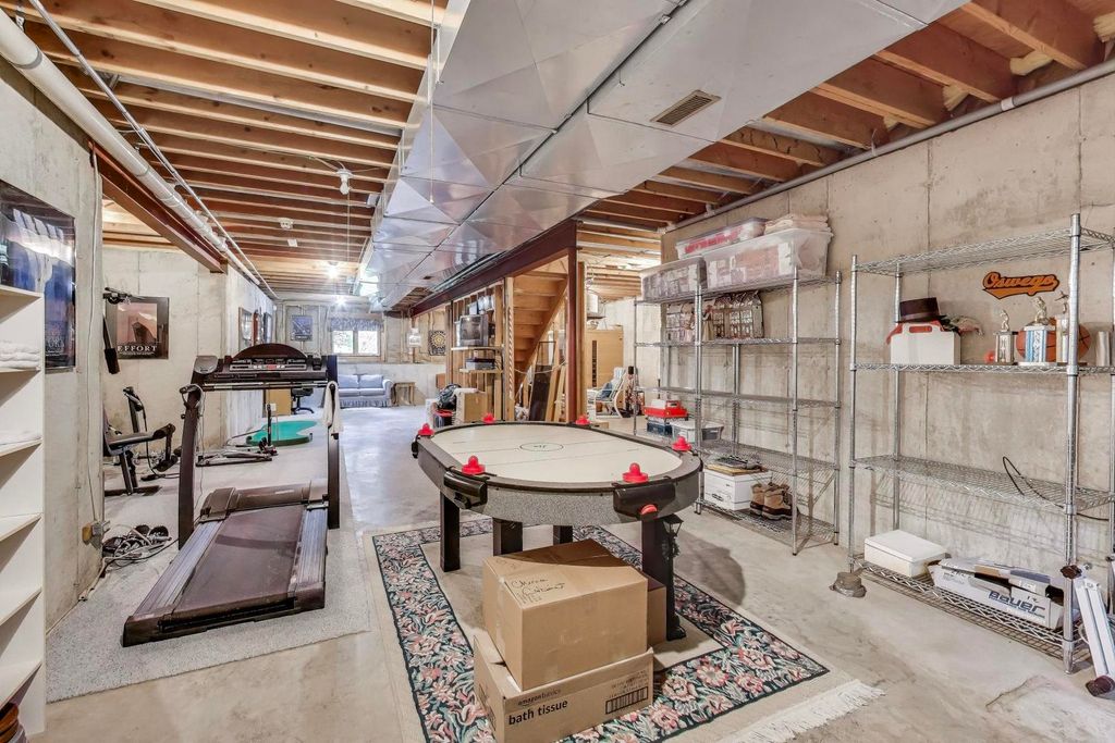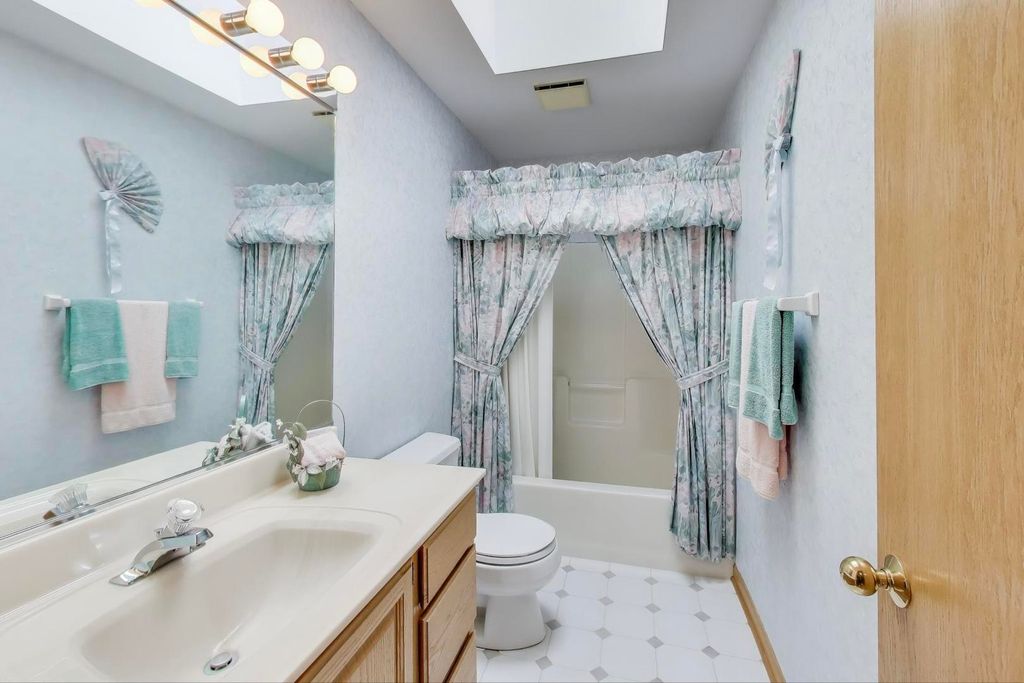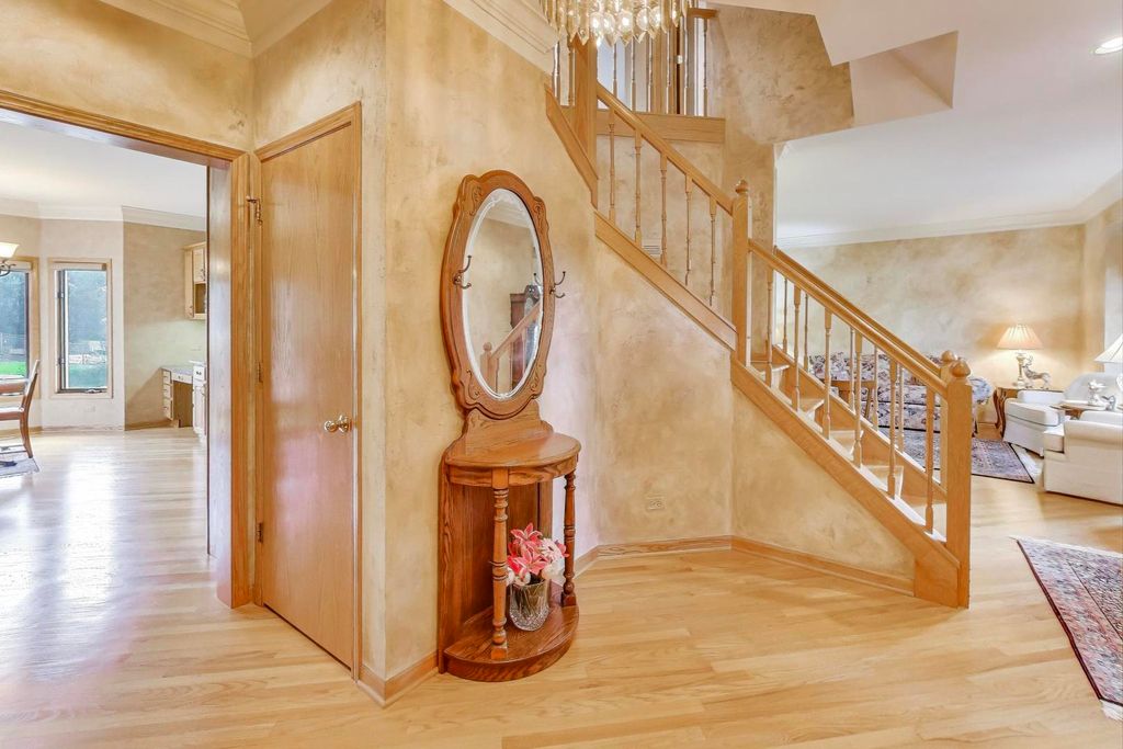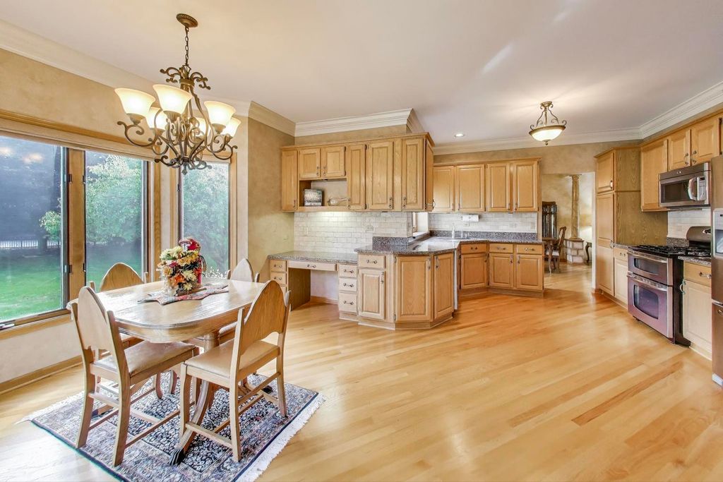 Nestled on a quiet cul-de-sac in highly sought-after Oak Valley Estates, this stunning former builder's model perfectly blends timeless elegance with everyday functionality. From the moment you step inside, you're welcomed by gleaming hardwood floors, a custom oak staircase, and rich crown molding that enhances the 9-foot ceilings throughout the main level. The formal living and dining rooms set the stage for elegant entertaining, while the spacious eat-in kitchen offers 42-inch cabinets, granite countertops, under-cabinet lighting, a deep Kohler cast iron sink, and stainless-steel Maytag and Bosch appliances. A stylish backsplash and custom drapes complete the look. The kitchen flows seamlessly into the inviting family room featuring new carpet, a gas fireplace, a built-in TV niche, and custom blinds-creating the perfect space for everyday relaxation and gatherings. Step through the sliders to your private outdoor oasis, complete with a large deck, in-ground pool equipped with volleyball and basketball. A shed keeps pool equipment neatly stored, while the automatic indoor control panel allows you to manage the pool's settings right from inside your home. The natural gas line to the firepit and grill makes outdoor entertaining effortless, and the in-ground sprinkler system ensures your landscaping remains lush all season long. Upstairs, the luxurious primary suite impresses with a tray ceiling, hardwood floors, dual closets plus a spacious walk-in with custom organizers, and a spa-style bath boasting a vaulted ceiling, skylight, dual vanities, soaking tub and separate shower with full body sprays and rain dome. Three additional generous bedrooms-including one with a vaulted ceiling-and a full bath with skylight complete the upper level. The English basement provides 9-foot ceilings, daylight windows, a workbench area, and is stubbed for a future bathroom, offering endless possibilities for additional living space and storage. Custom window coverings and thoughtful design details carry throughout. Modern updates and mechanical highlights include a Lennox high-efficiency furnace, Culligan water softener, reverse osmosis system, central vacuum with tools, and dimmer switches in key living areas. One-third of the home's windows have been replaced for added efficiency and comfort. The garage is fully drywalled and trimmed, with mounted wall storage units and a convenient service door. This home has been meticulously maintained and thoughtfully designed for modern living and entertaining. Enjoy neighborhood amenities including a park, and easy access to the village walking path and award-winning schools, Minutes away from Lake Geneva, the Chain O'Lakes, and both O'Hare and Milwaukee airports. Welcome home-where comfort, quality, and convenience meet in perfect harmony!