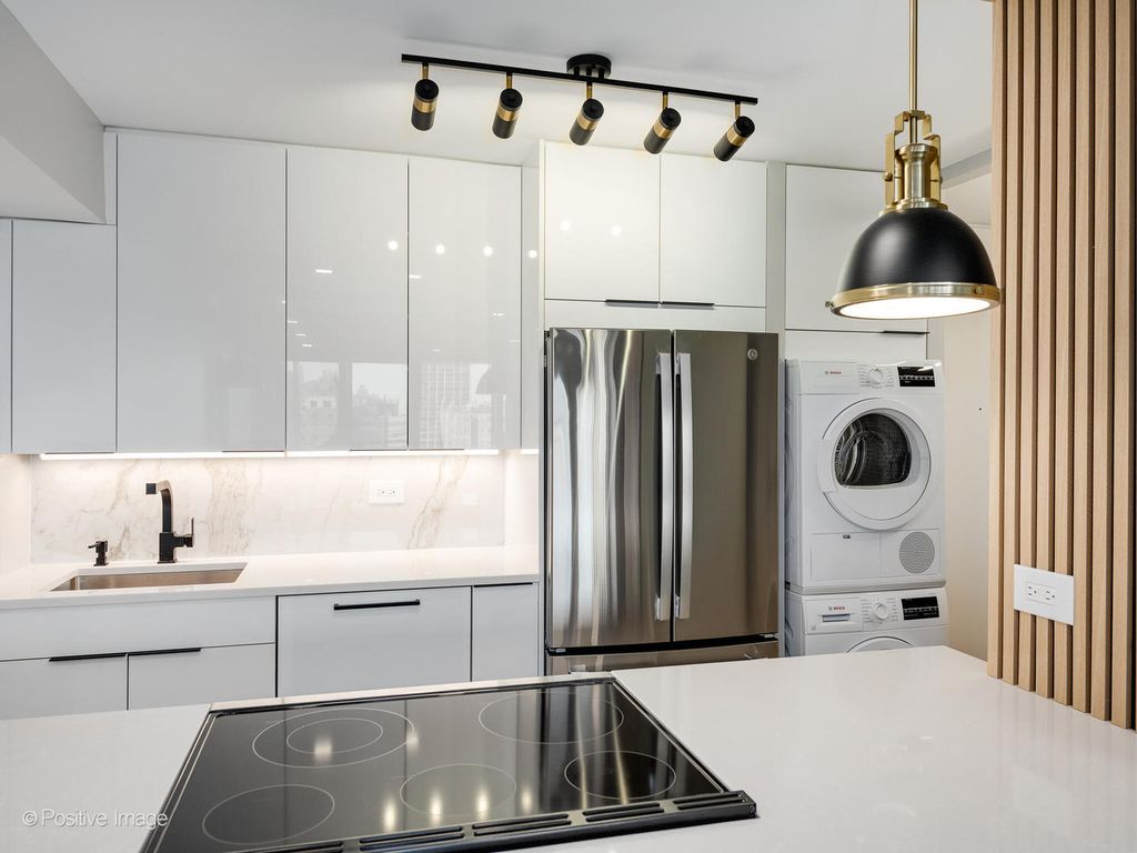 Presenting this rarely available spectacular newly gut rehabbed two bedroom unit with balcony on the much sought after east facing side of James House with lake views. Be the first to live in this beautiful unit, among the many new features are the in-unit washer & dryer. The entire unit was gut-renovated and finished to the highest standards. The large kitchen has contemporary gloss white cabinets with black accent hardware, under cabinet led lighting, quartz counters & peninsula with long breakfast bar, designer black/gold pendants & overhead and recessed lights, all new high-end appliances including french-door refrigerator, Bosch dishwasher with panel door and a Sharp microwave drawer. Separate Bosch Washer & Dryer are also conveniently added in the kitchen. The primary bedroom is spacious with a desk area and professionally organized closets. There are recessed lights over the bed. The 2nd bedroom offers many options as a guest bedroom or large home office/studio for Zoom calls. Bathroom is fully renovated, it has a new walk-in shower with sliding glass door, new vanity with quartz top, black hardware, two built-in mirrored medicine cabinets, upscale toilet , Kohler & Hansgrohe fixtures, finished with contemporary tiles. Step out onto your own private, east facing, 17 foot long balcony to enjoy views of Lake Michigan, Lincoln Park and the downtown skyline. Throughout the unit there are new wide-plank natural wood color floors, new plumbing, new electrical, designer lighting with new recessed lights throughout and professionally built-out closets including a walk-in entry closet. Specialized paint used with sanitizing technology. James House is a sought after building with many updates - newly renovated hallways, new boilers, new windows. There's a beautiful rooftop deck with all-season room and the best views in Chicago. Exercise room, 24 hour door & maintenance staff, additional storage cage. Low monthly assessment includes heat & air conditioning, TV cable and high speed internet service (everything except electricity). Sandburg Village amenities include two outdoor heated pools & sundecks, tennis courts, hospitality rooms- (some additional fees), garage parking. The landscaped courtyards, play lot, commercial facilities provide a welcoming community environment. Convenient for transportation - train/subway close by, buses, access to Lake Shore Dr, bike path. Located in Gold Coast / Old Town, close to downtown, Lincoln Park. Enjoy all attractions of the neighborhood - restaurants, nightlife, shopping, grocery stores, gyms, Lakefront trail, beach, parks. Pets allowed.
