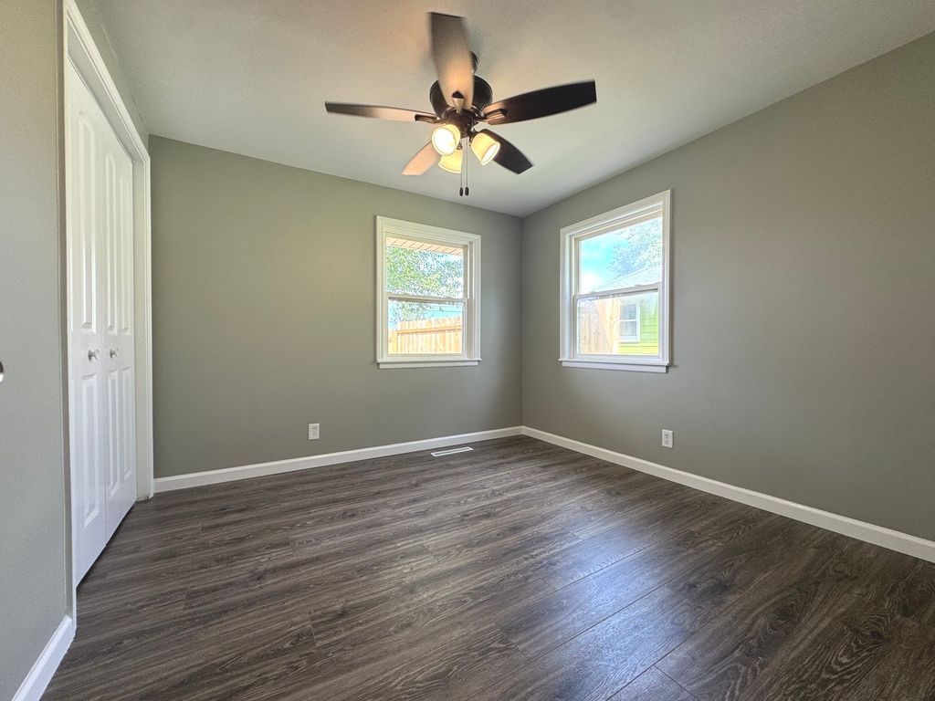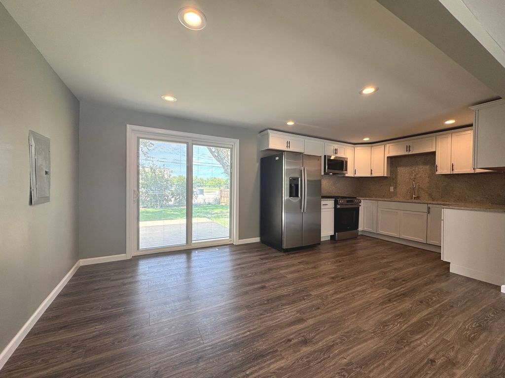 Brand NEW interior and beautifully remodeled Ranch home for you to enjoy, so many fresh modern updates! Open concept Living Room and Kitchen with new white cabinets, gorgeous granite countertops with matching back splash, 2 lazy Susan's, Stainless steel Refrigerator - Range - Microwave. The new sliding door leads you to a quiet fully fenced in yard with a new deck to relax and enjoy your morning coffee. The bathroom is beautifully updated with a porcelain tile surround with glass block window, niche, new vanity, porcelain tile floor, exhaust fan and washer/dryer. All new light fixtures, recessed lighting and ceiling fans. All new white interior doors, baseboard and trim, this home feels brand new inside! New Circuit breaker electric panel. The stone exterior of the house was also just tuckpointed, providing a new look to this home's exterior appearance. Newly landscaped and new concrete driveway. Roof 2024, Furnace and Central air 2025. Also, there is a wonderful park and walking trails at the end of the cul-de-sac.