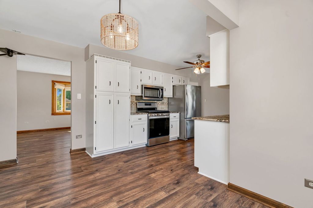 Welcome to this beautifully maintained ranch home offering comfort, style and space. Great convenient location and NO HOA! This 3 bedroom, 2 bathroom home features an updated full bath on the main level and new laminate flooring throughout the spacious family room and kitchen. Enjoy natural light pouring through the large bay window in the family room, creating a warm and inviting atmosphere. The kitchen boasts timeless white cabinetry, granite countertops, stainless steel appliances and space for your kitchen table - perfect for everyday dining. Downstairs, the fully finished basement expands your living space with a second family room, a full bathroom with a shower and ample storage options. Outside, enjoy a large fenced backyard ideal for entertaining or relaxing, complete with a generous-sized deck and storage shed. The detached 2-car garage is heated, offering year-round convenience. Recent updates include: Furnace (2019) Water heater (2020) Fence (2023) Windows (about 5 years old). Newer stove, fridge and blinds. Troy 30-C School District for grade schools and Joliet West High School. This move-in-ready gem is the perfect blend of charm and functionality. Don't miss your chance to call it home!