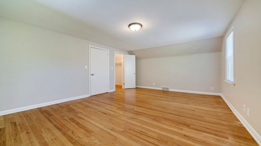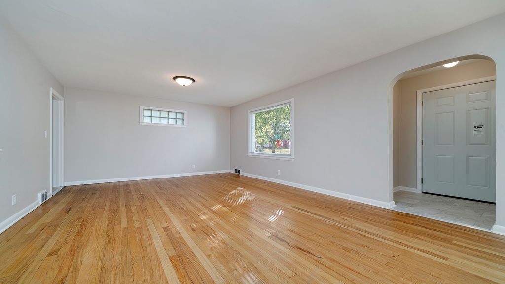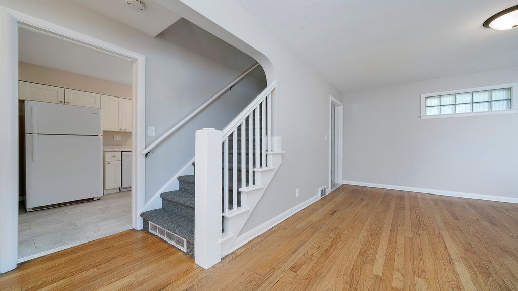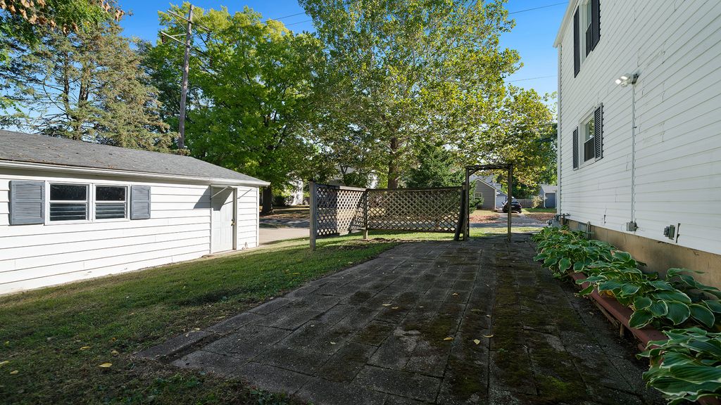 Welcome to this charming 1.5-story Cape Cod offering 3 comfortable bedrooms and 1.5 bathrooms. Step through the entryway into a bright, open living room perfect for relaxing or gathering. The kitchen features crisp white cabinetry and a clean, timeless look. The main level includes one bedroom and a half bath, while the upper level hosts two cozy bedrooms and a full bath. Enjoy the finished rec room in the lower level-ideal for a home office, playroom, or hobby space. Hardwood floors flow throughout, adding warmth and character. Outside, you'll find a spacious patio for outdoor enjoyment, a detached two-car garage, and a desirable corner lot. Situated close to everything, this home blends classic charm with comfortable living.