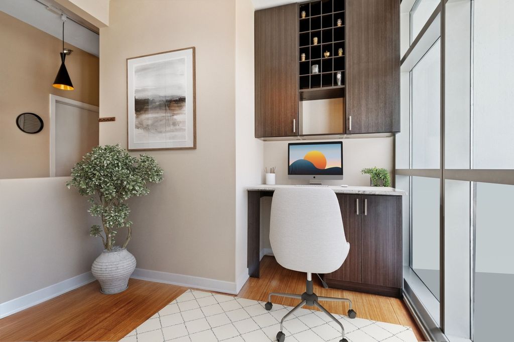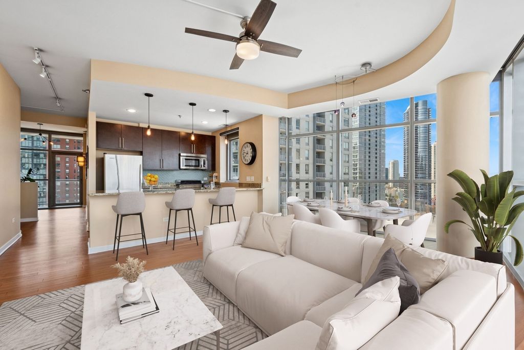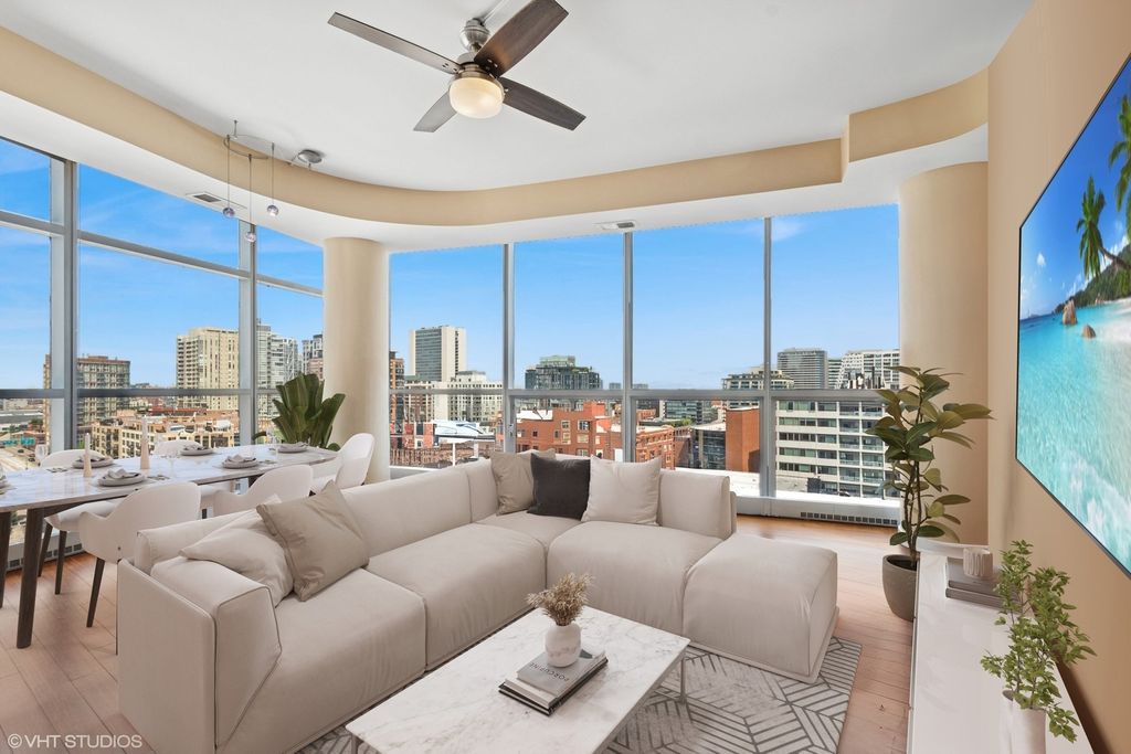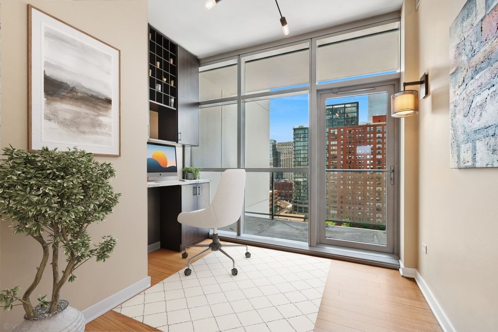 Welcome to Residence 1507 at the Silver Tower! Stunning Corner 2BD + Den or Office Space with Balcony & Iconic City View | a sleek home showcasing jaw-dropping skyline and sunset views. The home features wrap-around floor-to-ceiling windows from every room and a massive 25-foot south-facing private balcony and west-facing sunsets. Designed for modern living, the open-concept layout with split bedrooms. This luxurious home features a chef-inspired kitchen with rich walnut cabinetry, granite countertops, and premium stainless steel appliances. The expansive living space flows effortlessly, ideal for entertaining or relaxing above the city. The primary suite offers a spa-like escape with a double vanity, walk-in shower, and generous closet space. The versatile den easily functions as a home office, fitness nook, or formal dining area-your lifestyle, your call. Additional highlights include: Wide-plank hardwood floors, In-unit washer & dryer, and Extra storage included. Enjoy life at Silver Tower, a full-amenity high-rise offering: 24-hour door staff, State-of-the-art fitness center, Dog run, Skyline rooftop deck with grills & lounge seating, and Unbeatable River North location, steps from the L, expressways, top-tier restaurants, and nightlife. Indoor heated parking spot available for $35,000.