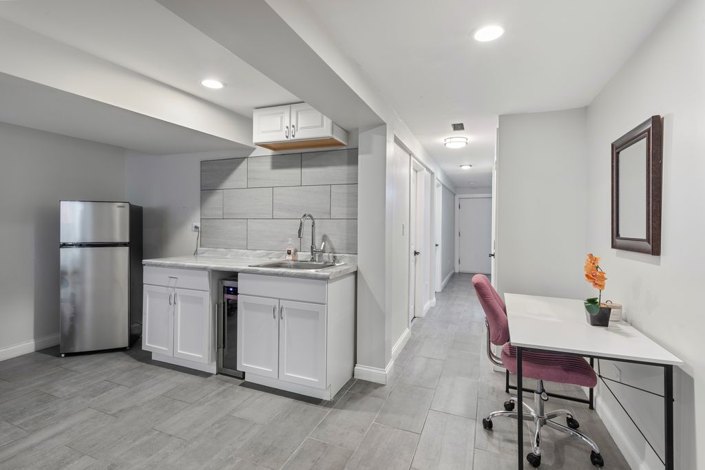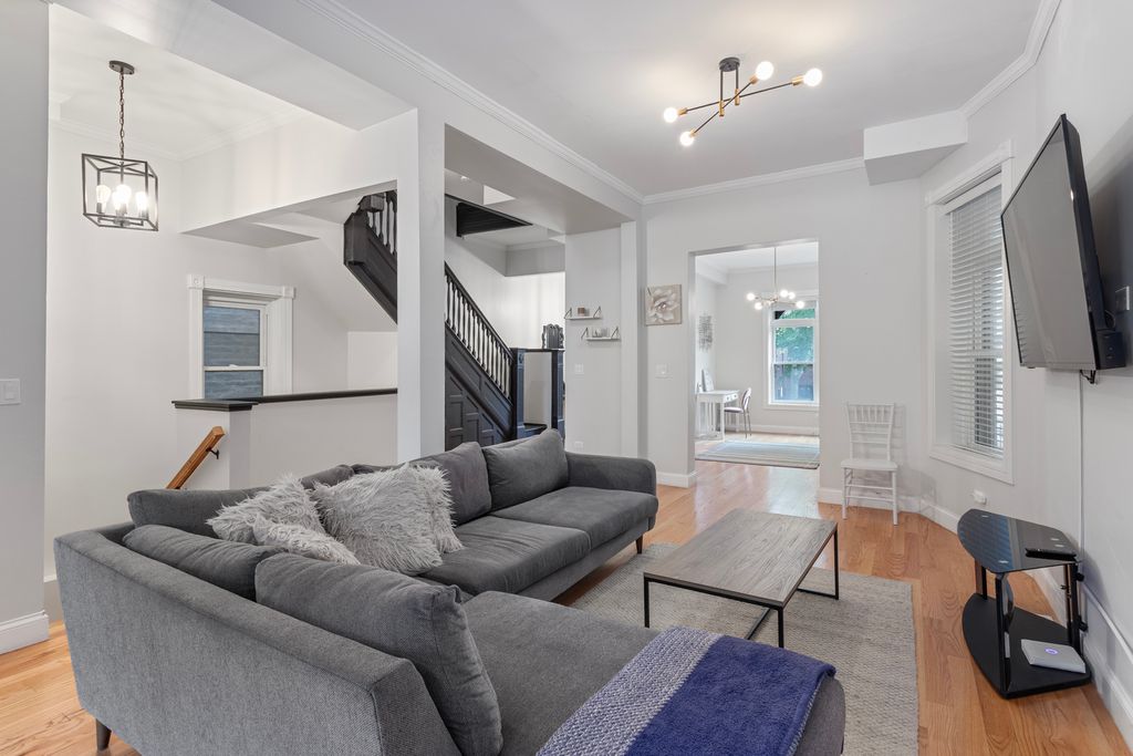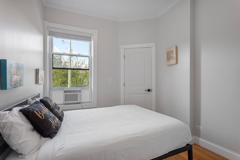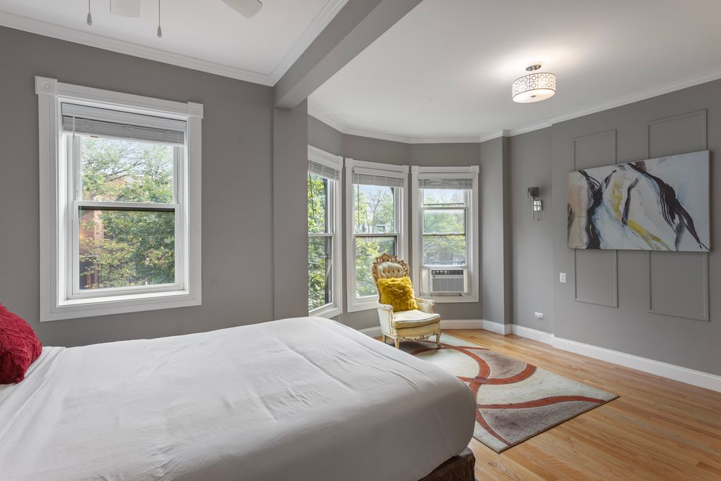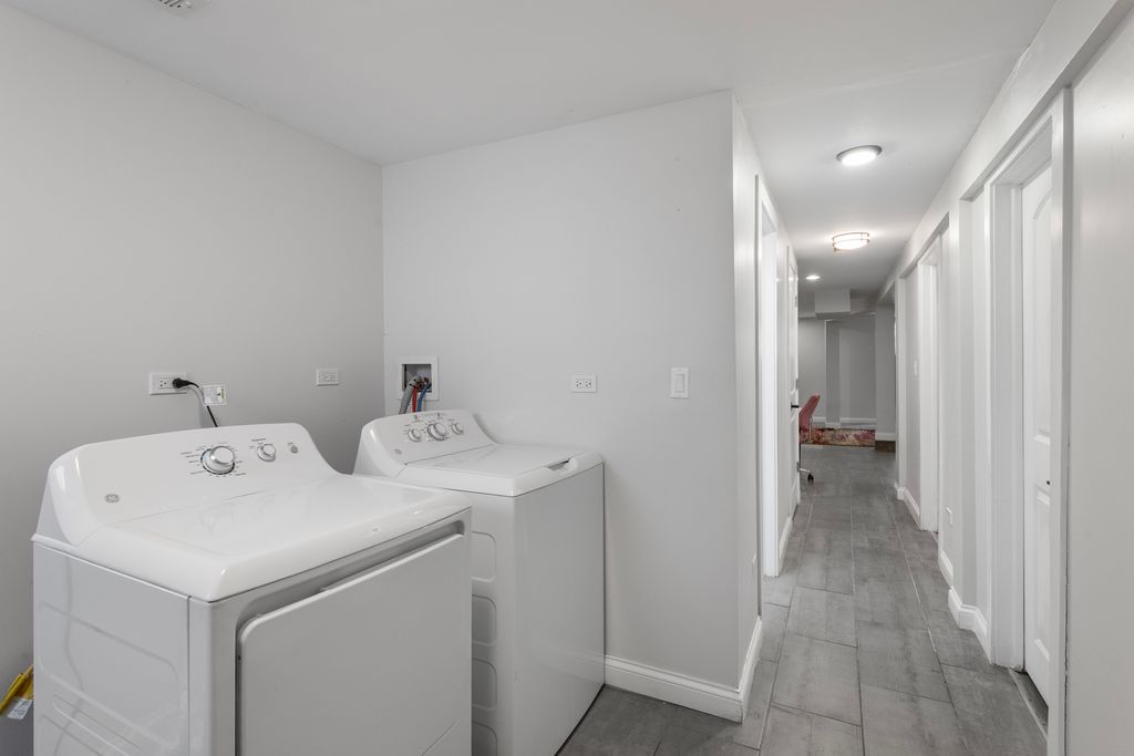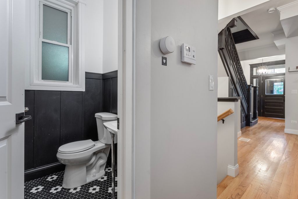 Step into this beautifully restored Washington Park Court Greystone-an architectural gem in historic Bronzeville. This 5-bed, 3.5-bath single-family home blends classic charm with modern luxury, thanks to a full 2021 renovation that included a new roof, electrical, plumbing, and mechanical systems. Upgrades in 2022 added more value: a second-floor laundry room, lower-level kitchenette, fully fenced backyard with paved patio, and gated driveway with remote access for two vehicles. Major mechanicals like the A/C condenser and water heater were also replaced. Inside, the original front door opens to a welcoming mudroom and grand foyer with soaring ceilings, hardwood floors, and oversized windows. The open-concept main level flows into a chef's kitchen with quartz counters, brass accents, 42" cabinets, and stainless-steel appliances. Upstairs offers four spacious bedrooms, two full baths along with the new laundry room. The primary suite features a custom walk-in closet and spa-like bath with dual vanity, soaking tub, and oversized shower. The finished lower level includes a wet bar with wine fridge, full-size refrigerator, fifth bedroom, full bath, second laundry area, and a generous rec room. Located minutes from Washington Park, Lake Shore Drive, the 90/94 expressway, and two Green Line stations, this home offers prime access to city life.