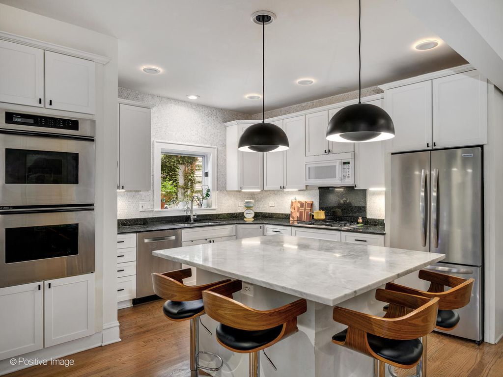 Welcome home to this stunning, center of town home, offering a perfect blend of exquisitely restored period details and modern amenities suited for today's lifestyle. The renovated kitchen is classic beauty, with its stainless steel appliances, double oven, large island, and white 42" cabinetry providing abundant storage. The kitchen opens into the family room making it the heart of the home, while thoughtful built-in storage creates a mudroom area by the back door. The expansive living room provides for two seating areas plus woodburning fireplace and is beautifully accented by dark wood trim and crown molding. Double doors open to the extra wide front porch spanning the width of the home, perfect for entertaining or relaxing outdoors. The spacious dining room is ideal for hosting holiday dinners and parties. Completing the main floor is the 4th bedroom and a full bath, ideal for guests or work from home. Take the beautifully crafted dark wood staircase up past the original leaded windows to the 2nd floor where you'll find the primary suite, two additional bedrooms, and another living area featuring a second woodburning fireplace. This room is currently used as an office, and would also work as a second family room or additional guest space. The massive primary suite boasts a sitting area, a wall of windows, and three closets including a spacious custom-organized walk-in. Primary bath features a whirlpool tub and separate shower. Two additional bedrooms, a full bath, and convenient 2nd floor laundry complete this floor. The unfinished basement provides another laundry room plus loads of storage space. In addition to the sprawling front porch, the large backyard also features green space, a back deck, patio for dining al fresco, and seating around a fire pit. 2.5 car heated garage with driveway providing even more parking space. All new custom lighting as well as original hardwood floors throughout. Dual zoned HVAC and updated plumbing, electrical, and windows. Recent updates include two new 75-gallon water heaters, newer washer/dryer, and both furnaces. All this AND an absolutely unbeatable location - one of the best blocks in Oak Park and so conveniently located, walkable to all the dining, shopping, cafes, and boutiques downtown Oak Park offers as well as the green line/Metra.
