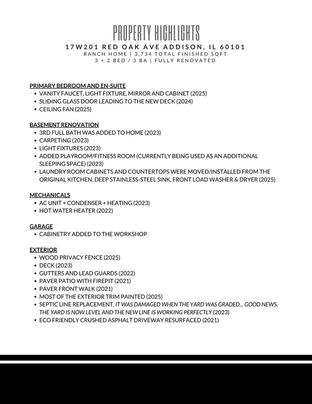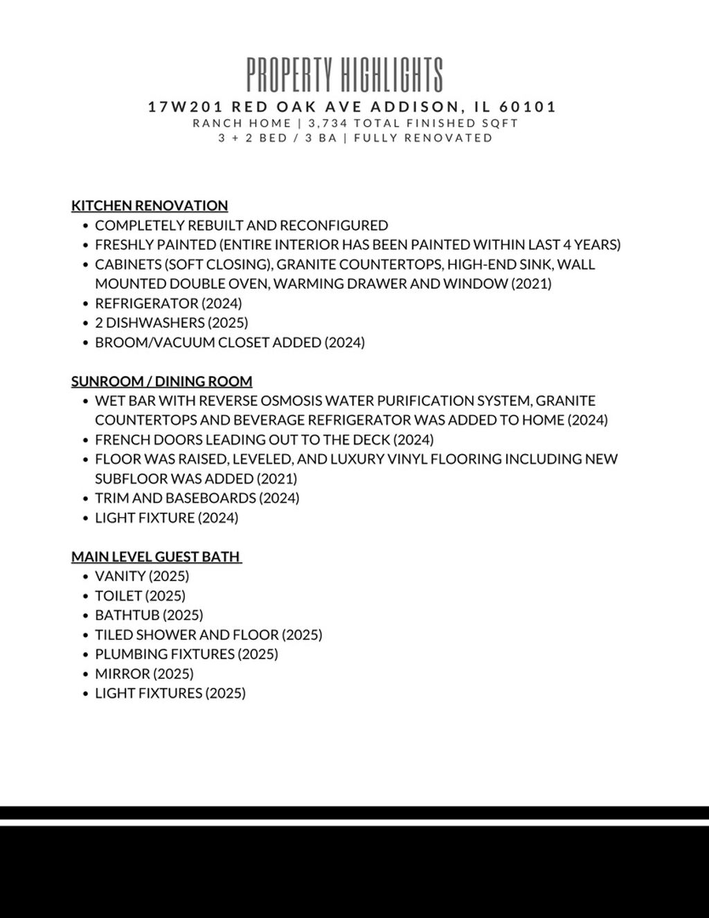 Fully Updated & Move-In Ready! 3,734 Total Finished SQFT. Stunning Open Concept Ranch on Expansive Private Lot - Ideally situated on nearly 3/4 of an acre across four separate PINs adjacent to Fischer Woods Forest Preserve.Inside, the home features cathedral ceilings and gleaming hardwood floors throughout the main level, creating a spacious and airy feel. The brand-new kitchen is finished with modern touches and flows seamlessly into a show-stopping four-season sunroom (currently used as a dining room) featuring a full-service wet bar with beverage refrigerator, and panoramic views of the serene, fenced-in backyard. Additionally, the main level includes a spacious family room with a wood-burning fireplace, brand new full bath, and three generously sized bedrooms, each offering ample closet space. The primary suite is a true retreat, complete with an en-suite bathroom and sliding doors that lead directly to a brand-new deck-ideal for relaxation or entertaining. Step outside to enjoy the newly installed paver patio with a built-in firepit, ideal for hosting gatherings. The oversized, deep two-car garage offers plenty of storage space and is large enough to accommodate a boat. Downstairs, the fully renovated basement offers incredible versatility with its own private exterior entrance. It includes two additional bedrooms, a spacious recreation room, a dedicated office, a flexible playroom or fitness room, and a newly added third full bathroom. The large laundry room is outfitted with an abundance of cabinetry, countertops for folding, an impressive deep stainless steel utility sink, and direct outdoor access- perfect for muddy shoes or paws. From top to bottom, this home has been thoughtfully updated and meticulously maintained. With its spacious layout, high-end updates, and incredible outdoor living areas, it offers the perfect blend of style, comfort, and functionality. LOW TAXES and no transfer tax. Seller is open to providing a credit to bring public water and sewer to the home.