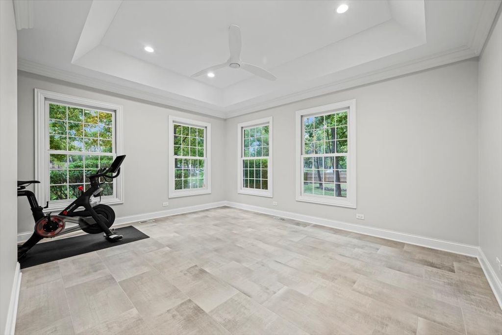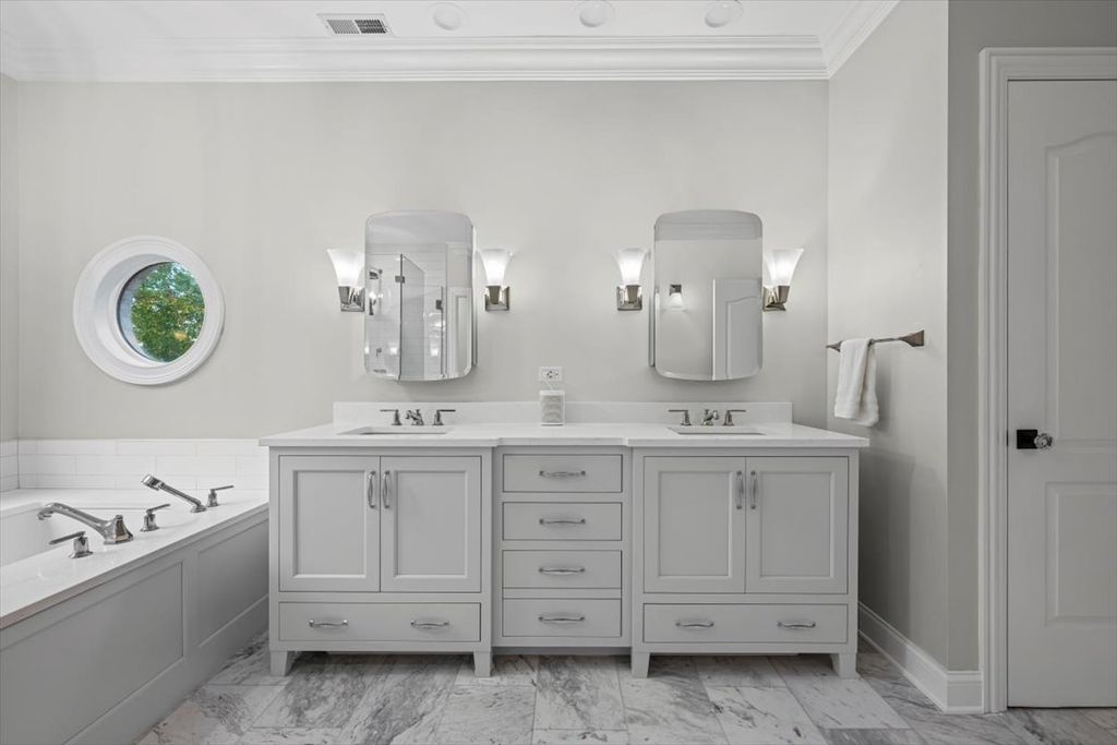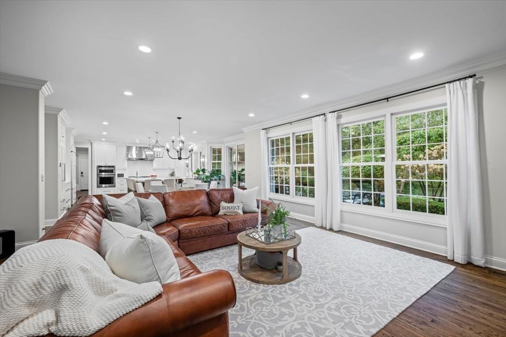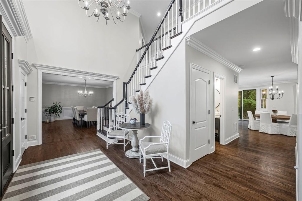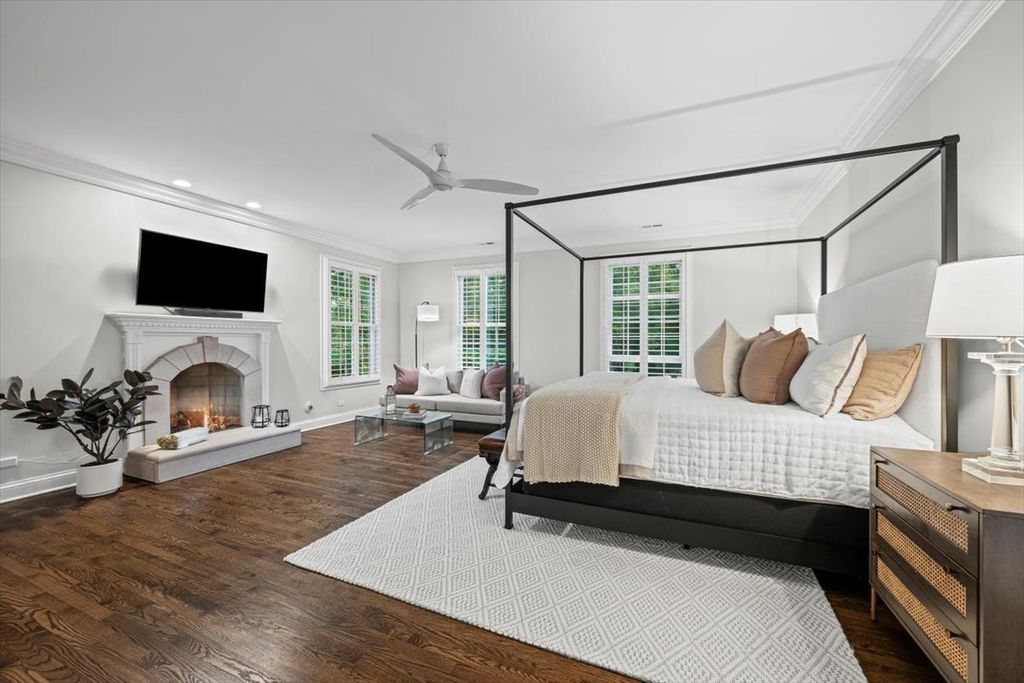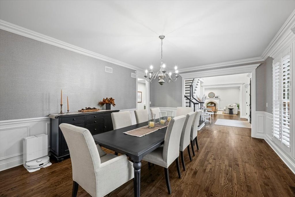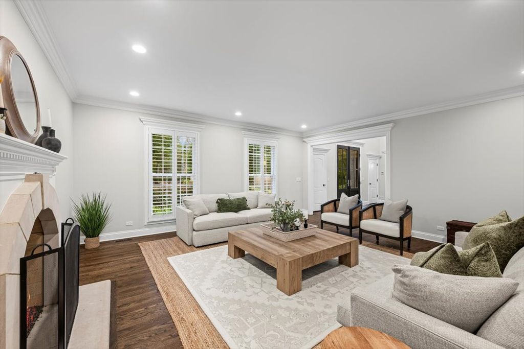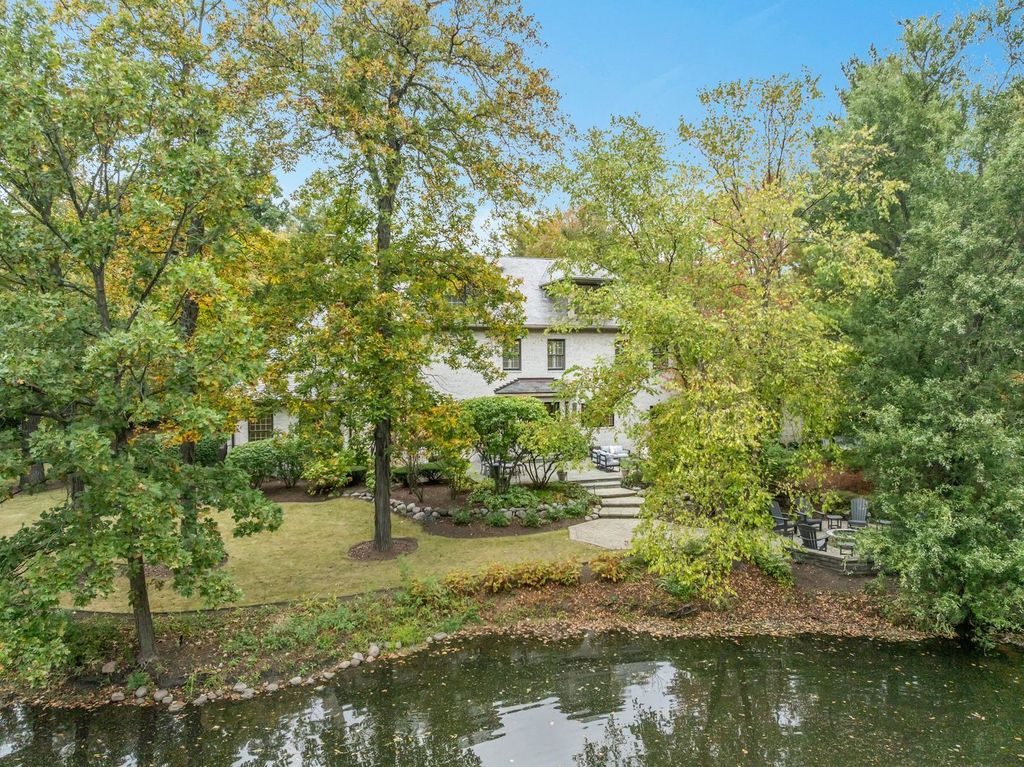 Welcome to your dream home, a stunning Georgian-style two-story brick residence with a timeless slate roof, nestled on a quiet, tree-lined cul-de-sac. Begin your journey with a grand entry through a motorized gate, offering both privacy and security, conveniently operable via a phone app. The elegant circle driveway is perfect for hosting gatherings, with an unobtrusive 3-car side-load garage that maintains the home's impeccable curb appeal. Set on nearly 2 acres of a wooded sanctuary, this property features a private, aerated pond ideal for kayaking or paddleboarding. The expansive yard is a professional landscaper's masterpiece, boasting multiple spaces for relaxation and entertainment, including a stunning bluestone and tiered paver patio, alongside separate fire pit and fire feature areas, all overlooking the tranquil pond. Step inside to a meticulously renovated interior featuring 9-foot ceilings throughout. A grand foyer with a custom staircase leads you to a spacious dining room on the left and a cozy living room on the right, complete with a gas-burning fireplace. Adjacent to the living room is a private office space. The heart of this home is the chef's kitchen, equipped with high-end appliances, a large eat-at island, and space for a breakfast table. Between the kitchen and dining room is a large butlers pantry with a sink and wine refrigerator, perfect for dinner parties. The kitchen flows seamlessly into the family room with another gas fireplace, offering a warm and inviting space for family gatherings. A four-seasons room adjoins the family room, providing versatility as a private office or workout room, with picturesque views of the outdoor oasis. A slider door from the kitchen opens to the rear patio, perfect for al fresco dining. The main floor also offers a powder room, a full bathroom, and a convenient mudroom and laundry room equipped with dual front-load washers and dryers, ideally located off the garage entrance. Ascend to the second floor to discover five additional bedrooms, including a spacious primary suite, each with updated en-suite bathrooms and generous closets. The large primary suite features a fireplace and an incredible renovated bathroom with a Bain Ultra hydrotherapy tub overlooking the serene pond. A large third-floor recreation room provides the perfect space for game days or casual relaxation. The home is bathed in natural light, creating a bright and airy ambiance. The partially finished basement includes a workout room with rubber athletic flooring and offers nearly 3,000 square feet of customizable space. Located just a few blocks from restaurants, the Metra train, grocery stores and shopping, and with easy highway access, this fully renovated home leaves no detail overlooked. Experience the perfect blend of luxury, convenience and serene privacy in this stunning retreat.