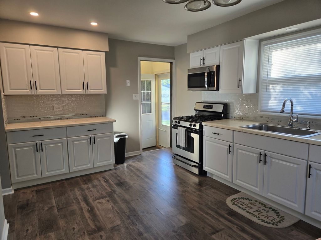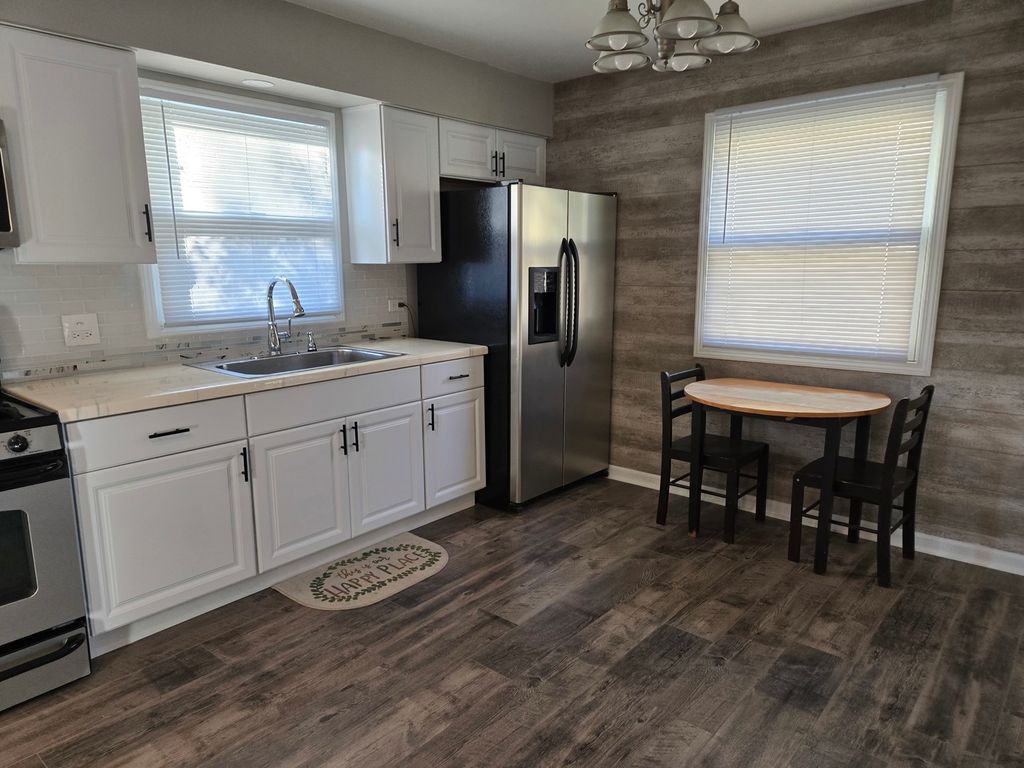 Move in ready totally! Remodel top to bottom three bedroom ranch with full basement ready to be finished off. Eat-in kitchen with all appliances, cabinets and backsplash. Three spacious bedrooms, fully remodeled bathroom with new vanity, toilet, bathtub surround. New water resistant laminate flooring, new AC, furnace and hot water heater. New exterior doors plus 6 panel interior doors. New lighting fixtures, new side and landscaping. Full fenced in yard plus 2 1/2 car garage. Wonderful location, close to park restaurants and shopping.
