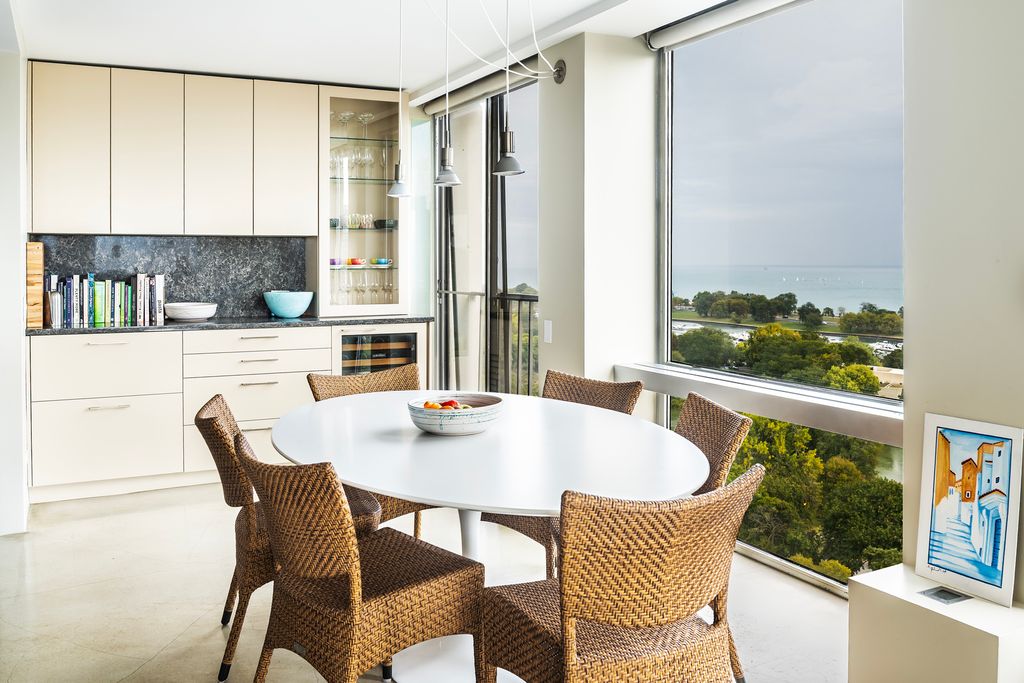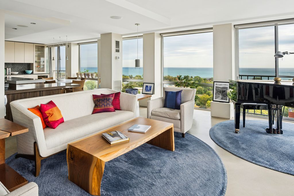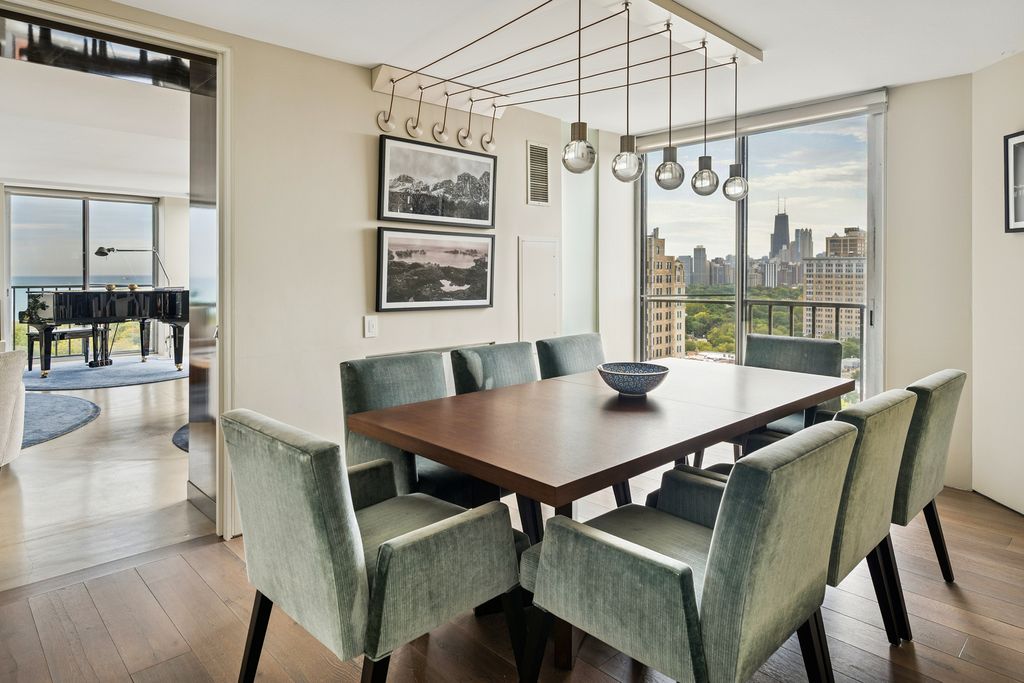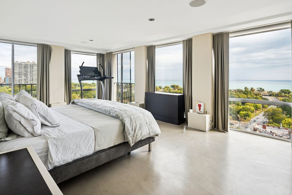FULL WALK THRU ON VIRTUAL TOUR BUTTON. Three condos have been seamlessly combined to create a spectacular 3,350 sq. ft. four-bedroom residence showcasing world-class views of the lake, park, and skyline. This striking contemporary home features a clean, modern design with exceptional flow and generous, flexible living spaces-all framed by floor-to-ceiling windows capturing breathtaking panoramas. Polished concrete and hardwood floors, European-style baths, and designer lighting elevate the aesthetic throughout. The northeast corner living and dining area offers a fireplace, custom built-ins, electric shades throughout and stunning natural light. The chef's kitchen impresses with Leicht cabinetry, Thermador induction cooktop, Bosch dishwasher, Dacor ovens, a breakfast bar, and ample space for a dining table.The luxurious primary suite includes a custom walk-in closet and spa-like bath with wall-mounted Duravit sinks, airjet soaking tub, and steam shower. Additional highlights include three more bedrooms and baths, a family room, a den/office, and in-unit laundry. Valet and self-parking available. Ideally located within the highly sought-after Lincoln Elementary School District.