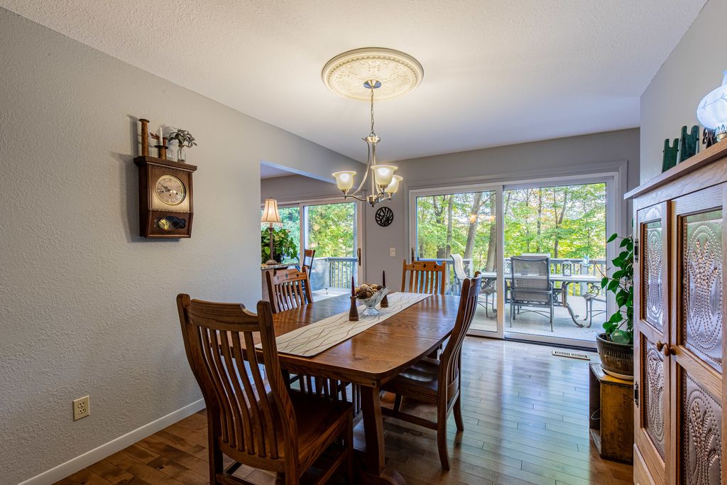 Get out your wish list and check, check, check! Beautiful home located on 2.3 acres in Deer Run North. Enjoy the peaceful surroundings of nature in this 4 bedroom, 3 1/2 bath home. Walk up the stamped concrete sidewalk and enter the welcoming foyer. The living room is flooded with natural light by four patio doors that open to the huge deck overlooking the wooded back yard. Kitchen has cherry cabinets with a rotating pantry, slide out shelving and granite counter tops. Stainless appliances included. Upstairs the master suite has a walk in closet and tiled shower. Three more bedrooms, a bonus room and a hall bath complete the upstairs. The bonus room could be a great place to have a reading space, computer room, or to relocate the laundry. Walk out basement has a finished 17x30 family room, fireplace and a full bath. The oversized 2-car garage is insulated and has plenty of room for a work bench or storage. A utility shed is located in the back yard for mowers and garden tools. This home is a quiet sanctuary with ravines on either side. Exterior of home was painted summer of 2025. The landscaping has been professionally designed with several perennials. Recent upgrades include new master bath window, new frig (18 mos.), garage roof (6 years), stamped concrete sidewalk (2 years), reinforced driveway (6 years), upstairs baths (6 years), painting, deck carpet, radon mitigation system (Oct. 2025) and deck carpet. Community well was new this summer. Bring your wish list and take a look!