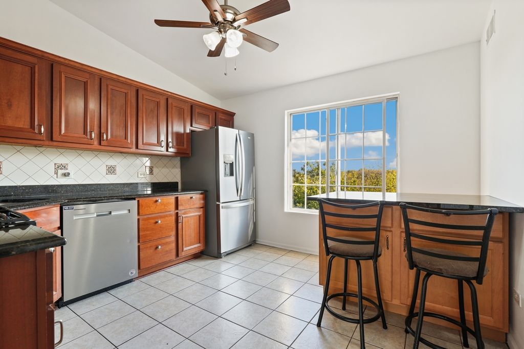 Bright and sunny second-floor condo in desirable Autumn Ridge! This spacious 2-bedroom, 1-bath home features an open layout with a large living room flowing into the dining area with vaulted ceilings. Wood laminate flooring throughout most of the home adds warmth and style. The kitchen offers stainless steel appliances, an island with a breakfast bar, ceramic tile flooring and a convenient laundry closet with extra storage. The primary bedroom includes a walk-in closet, while the second bedroom features a large closet as well. The bathroom with soaking tub is accessible from both the primary bedroom and the hallway. Enjoy beautiful views from the bedroom and kitchen windows with no rear neighbors. Recent updates include Furnace & A/C (2024), Water Heater (2020), and Appliances (2020). Building improvements include new roofing (2021) and new siding (2023). Additional highlights: 1-car attached garage, lower-level storage unit, and fresh paint throughout. Zoned to highly rated Lockport Township High School East. Convenient location off Route 30 with easy access to I-55 and I-80, close to shopping, dining, and more!