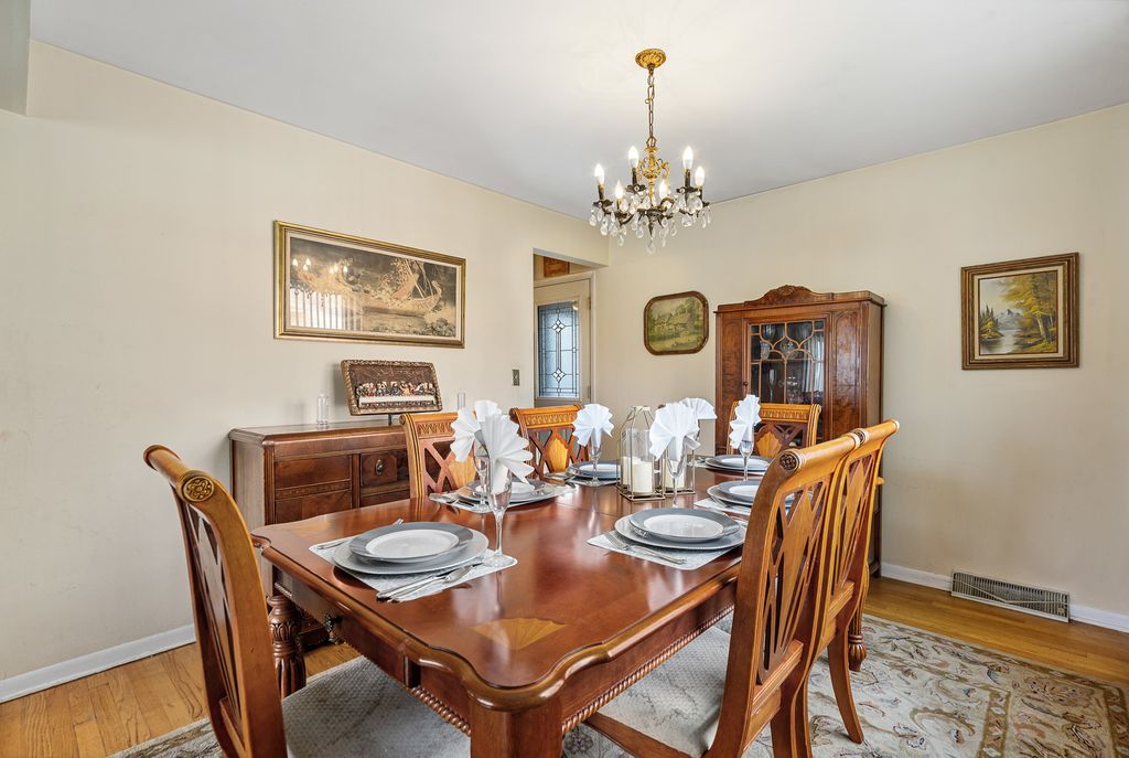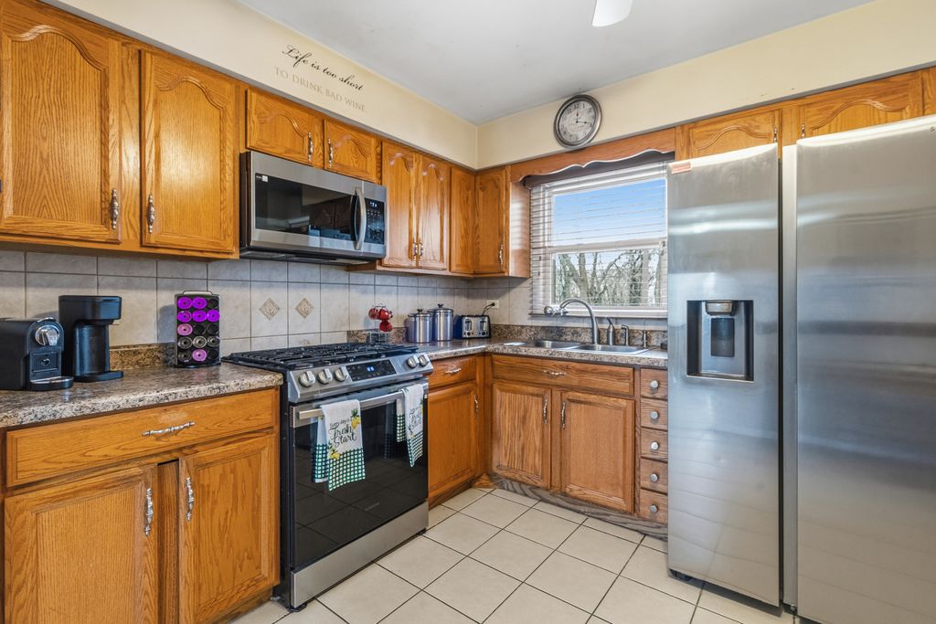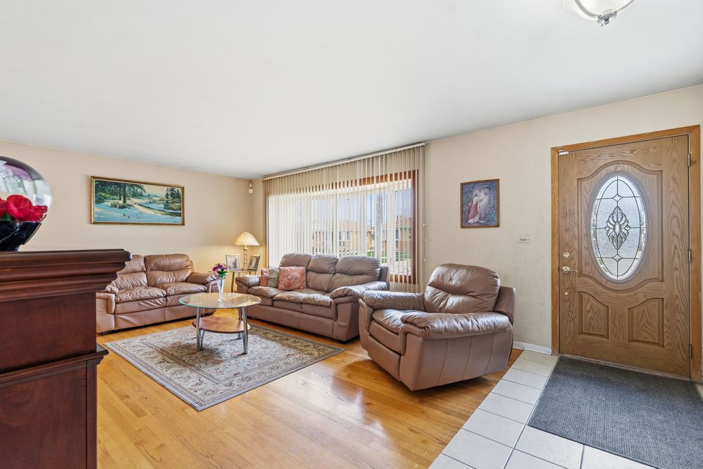 Lovely split-level home offering space, style, and exceptional outdoor living! This well-maintained residence boasts a stunning vaulted four-season room with an electric fireplace overlooking the large privacy-fenced yard featuring beautiful gardens, a fire pit, and built-in benches-perfect for relaxing or entertaining. The sun-filled living room and formal dining room showcase hardwood flooring, while the kitchen offers oak cabinets, pantry, newer stainless steel appliances, ceramic tile flooring, and chair rail detailing. The main bath features a double vanity and whirlpool tub, and hardwood flooring runs throughout most of the home. The primary bedroom includes a private half bath for added convenience. The lower level features a spacious family room with laminate flooring, a sink for a future wet bar, and an additional full bath-ideal for entertaining or related living. Additional highlights include a 21/2 car extra-deep attached garage with pull-down attic and abundant storage, plus newer furnace, air conditioner, and hot water heater (approximately three years old). This three-bedroom, 21/2-bath home combines comfort, functionality, and a park-like setting inside and out.