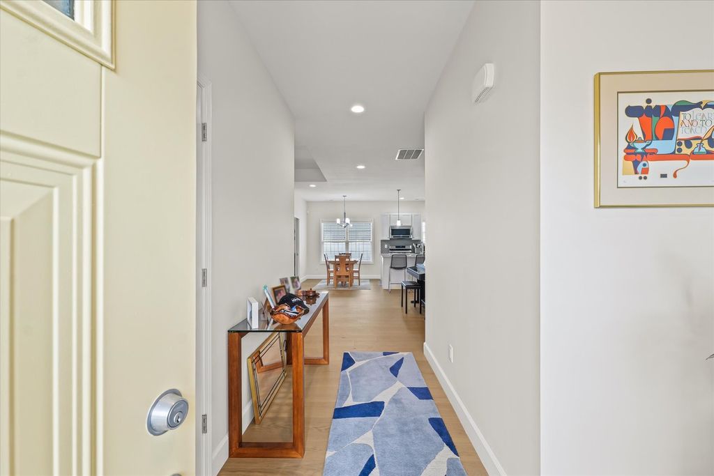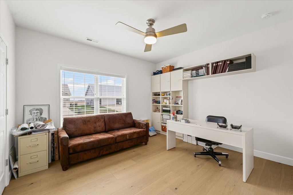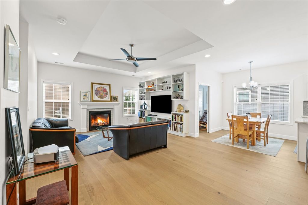 This beautifully maintained ranch home, built just four years ago, offers 2 bedrooms and 2 full bathrooms and showcases an open-concept floor plan that seamlessly connects the living, dining, and kitchen areas. Step inside to find 9-foot ceilings, upgraded finishes, and engineered Norwegian veneer flooring flowing throughout the entire home. The kitchen includes upgraded appliances, quartz countertops, a center island, and a corner pantry for added storage. The living room features sleek Techline cabinetry, complemented by matching built-ins in the second bedroom, currently serving as an office. The primary suite is spacious and inviting, complete with a walk-in closet and an adjoining bath with a step-in shower and dual vanities. The laundry room offers room to add a folding counter for additional convenience and the washer and dryer are just 3 years old. Originally an enclosed porch, the now fully finished bonus room provides a bright and comfortable space perfect for a home office, reading nook, or hobby area, with access to the custom wood deck. Situated just minutes from Meijer, Carle Clinic, Meadowbrook Park, and a variety of restaurants. Make Memory Lane your next home!