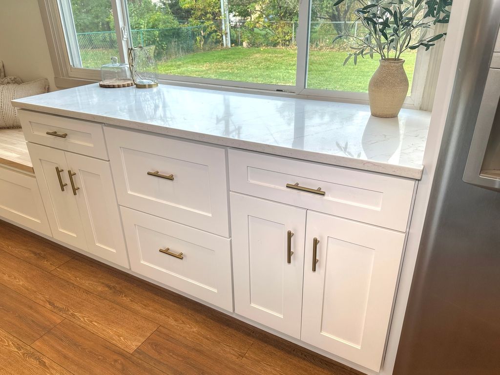 Step into this completely remodeled showstopper where modern design meets everyday comfort! This 3-bed, 1-bath ranch has been professionally designed from top to bottom - featuring luxury vinyl plank flooring, stunning quartz countertops, dreamy backsplash, and a custom built-in breakfast nook with butcher-block seating and drawer storage. The kitchen is a dream with brand-new stainless-steel appliances including range, microwave, dishwasher, and garbage disposal - plus endless cabinet space for storage. Just off the kitchen, you'll find the laundry room is made stylish and convenient with Samsung front-load washer and dryer topped with double quartz folding shelves. The stunning bathroom features penny tile flooring and custom wall tile and new vanity, while the primary bedroom highlights a designer accent wall that adds personality and charm. Major updates include a new roof (OCT 2025), furnace, A/C, and water heater (2024) for total peace of mind. Outside, enjoy brand-new concrete driveway, walkways, and a large patio-perfect for entertaining. The oversized one-car garage has new drywall and a pristine epoxy floor, creating a clean, functional space. Laundry is made stylish and convenient with Samsung front-load washer and dryer topped with a quartz folding shelf. Located in the highly desired Coventry neighborhood, near parks, schools, and downtown Crystal Lake, this turnkey, move-in ready home stands out with its designer finishes and timeless appeal. No gray and white here-this one is full of warmth, style, and personality! You'll be the talk of the neighborhood at 600 Sussex Lane!