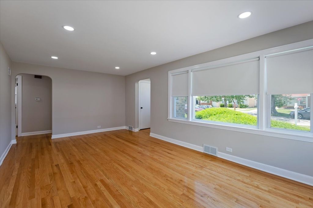Beautifully updated 3-bedroom, 1.5-bath ranch situated on an oversized double lot in the highly regarded Park View School District 70. This home features a spacious open-concept living and dining area, perfect for entertaining. The newly renovated kitchen boasts elegant quartz countertops and brand-new stainless steel appliances. Gleaming refinished hardwood floors run throughout the main level, complemented by fresh, neutral paint in every room. The completely remodeled full bathroom includes a large built-in storage cabinet for added convenience. Downstairs, you'll find a massive fully finished basement with an updated half bath and direct access to the expansive backyard. Enjoy the massive outdoor space with a detached two-car garage and additional parking on the side drive. Ideally located near the expressway, library, parks, and scenic forest preserves - this move-in-ready home offers comfort, style, and convenience.