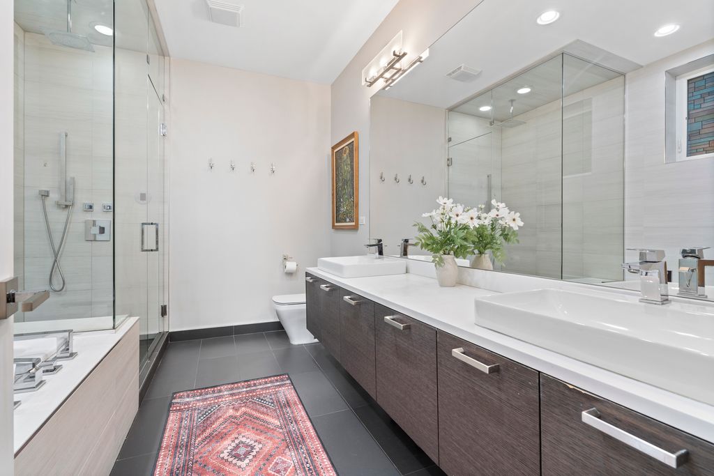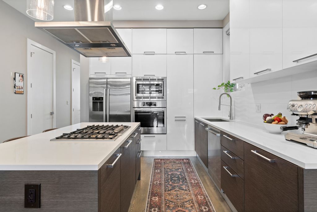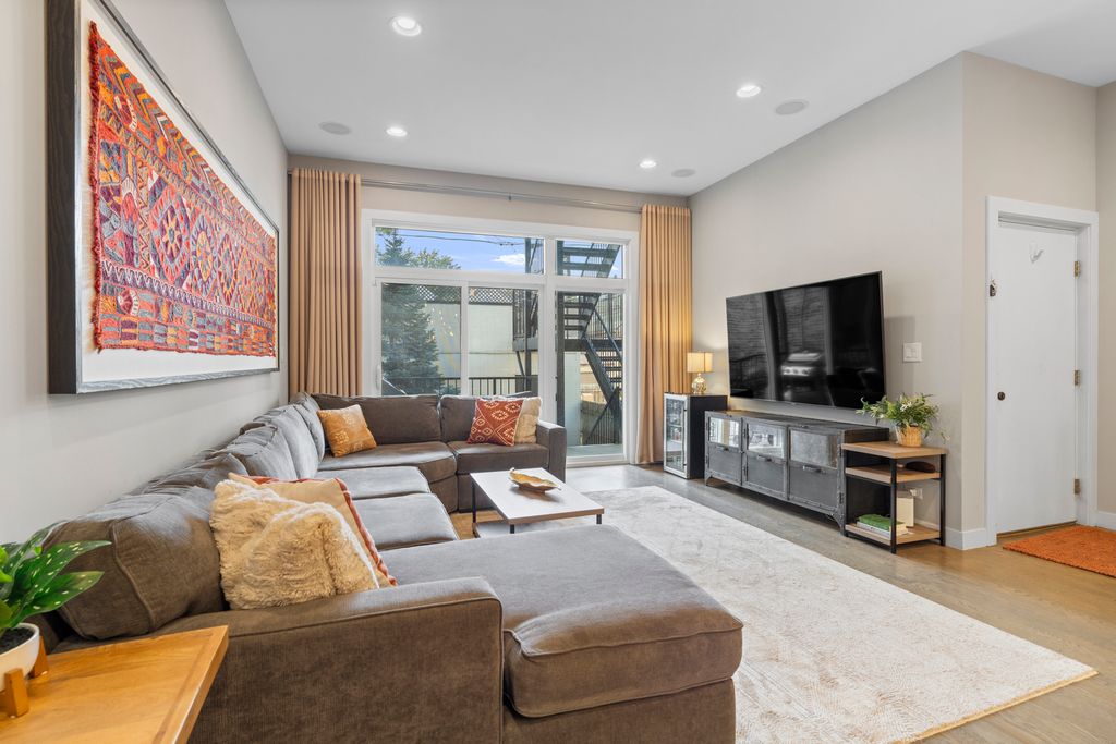A gem in coveted East Village, this impeccably maintained 3 bed, 2.5 bath duplex down with a private garage roof deck and large backyard oasis in the city all tucked on a quiet, tree-lined one way street, is not to be missed! The main level features an open-concept layout with natural light from east and west facing floor-to-ceiling windows. The sleek Unico kitchen offers two-tone cabinetry, quartz countertops, Bosch stainless steel appliances, an eat in island with built-in cooktop, and designer lighting. The spacious dining area flows into a nice size family room with access to the private balcony. Beautiful oak hardwood floors, custom window treatments, a sleek powder room and multiple professionally organized walk-in closets will be found through this level as well. All three bedrooms are located on the lower level along with laundry and additional storage. The oversized primary suite easily fits a king bed and features a spa-caliber ensuite with a double vanity, radiant heated floors, steam shower, and separate soaking tub. Two additional large bedrooms share a full bath down the hall. The pied de resistance? A true oasis in the back outdoor space with a private garage roof deck connected directly from back stairwell where you can also access a lovely common backyard with a pine tree for rustic ambiance. 1 garage parking space included. Situated on a quiet residential block just steps from some of East Village's best dining, parks, and shops, this home offers modern comfort and city living at its best.