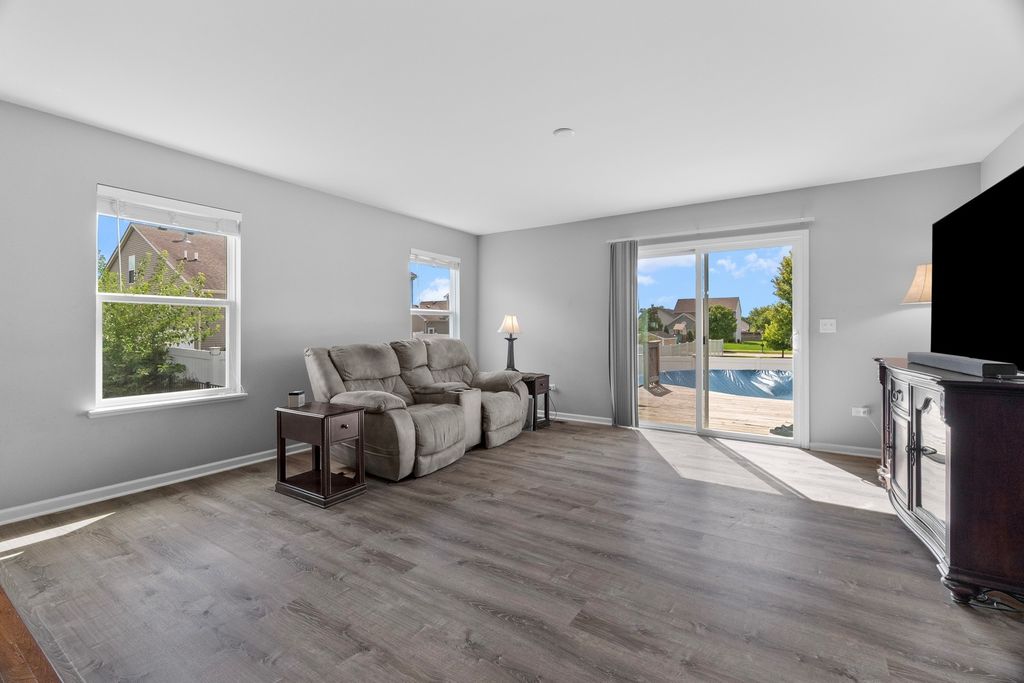 SPACIOUS SPRAWLING RANCH near 2000 SQFT with 3 beds and 2 full baths! built in 2015, this ranch home offers so much space; a great home for entertaining! Adorable covered porch greets you upon entry into the homes foyer. Expansive dine in kitchen with grande island (large enough for 5 bar stools), loads of floor to ceiling cabinetry, solid surface counter tops, double oven, and all SS appliances. Kitchen opens to family room with plenty of windows for natural lighting and newer flooring. Owners suite boasts walk in closet and private bath with separate tub and walk in shower. 2 additional large bedrooms and full hall bath. One of the bigger lots in Hunter's Ridge, completely fenced in with above ground heated pool and surrounding deck. HUGE ranch basement with concrete crawl space. New hot water heater 2025, AC 2024, Owners bath tub 2025. All Minooka schools!