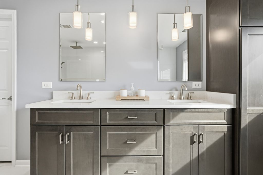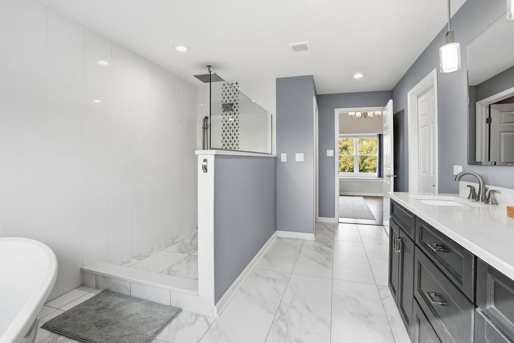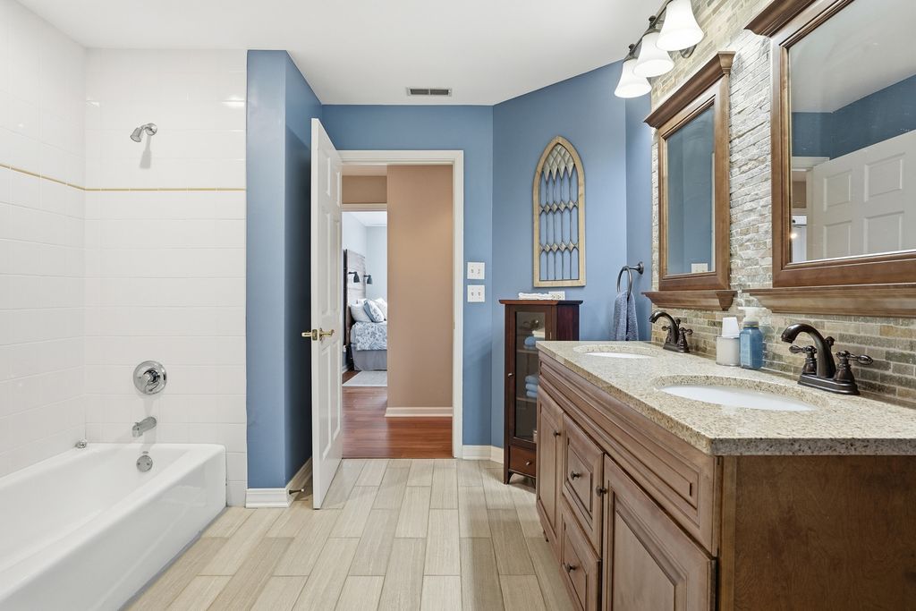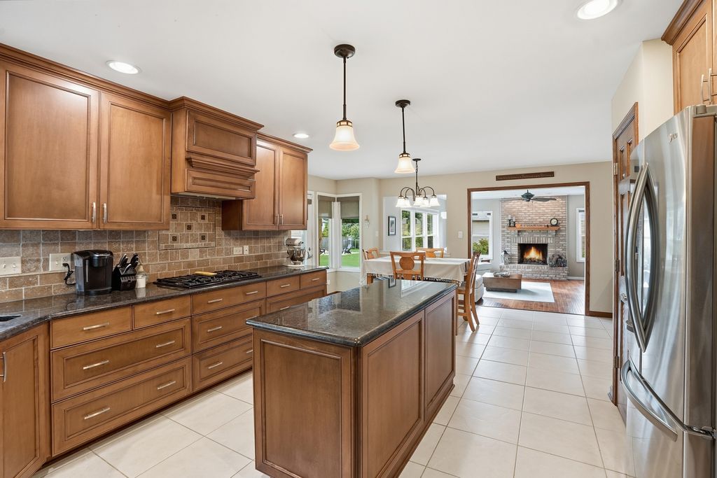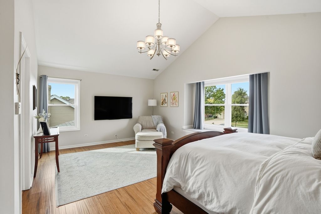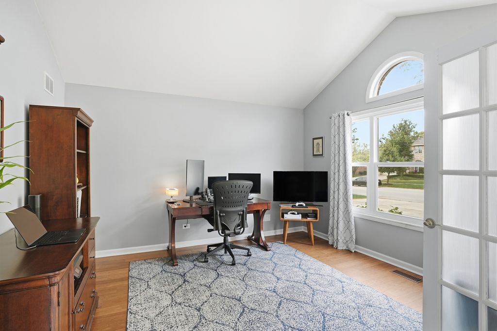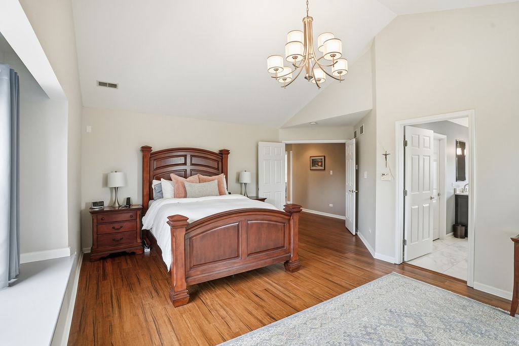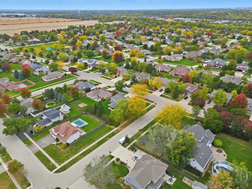 Immaculate and full of updates, this wonderfully located 2-story corner-lot home features 4 Large Bedrooms, 4 Bathrooms, and over 4,000 finished SF! Located in the Heart of New Lenox, near Wildwood Park, New Lenox Commons, all the shopping Rt. 30 has to offer, with quick access to I-80, this home has it all. Upon entering, you are greeted with an open and airy foyer with the vaulted ceiling home office conveniently located and equipped with private French doors. Huge 2 story living room opens to the formal dining room with hardwood flooring. The spacious eat-in kitchen, renovated in 2015, is finished with Tri-Star cabinetry, granite countertops, cooktop stove, massive island, and TWO pantries. Step down into the generously sized family room with hardwood flooring and a charming brick gas fireplace. The main level laundry room features built in cabinetry, folding table, utility sink and second refrigerator along with a gas hookup for second dryer if desired. The main level is rounded out with the beautifully renovated powder room. Upstairs you will find all 4 bedrooms including the master bedroom complete with vaulted ceilings, HUGE fully renovated master bathroom (2021) with double vanity sink, soaking tub, full tile walk-in shower, and in-bathroom walk-in closet with large tile flooring continued. The entire upstairs was refloored with scraped bamboo hardwood (2022). The fully finished basement is an entertainer's dream with a full bar, 9' poured walls and 8' ceiling with drop tile, full bathroom, and massive storage space. Step outside from the kitchen to the custom covered patio with recessed lighting, ceiling fan, 3 TV hook-ups and built-ins, natural gas line for the grill, AND Sunsetter awning for added shade. Last but not least is the heated 3-car garage with additional utility sink, workbench, service door to the backyard, and 3-car wide concrete driveway. Updates include: All New Pella Windows (2020) Roof (2013) Floors (2022)