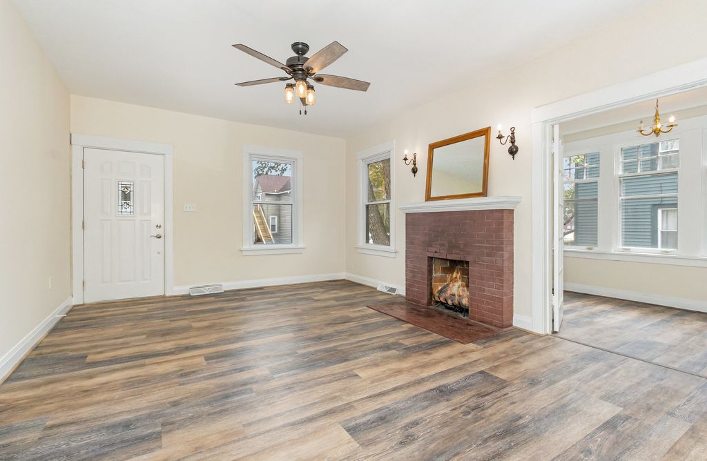 Welcome to this beautifully updated ranch-style home, perfectly located within downtown Plano. From the moment you arrive, you'll be drawn in by the inviting front porch-an ideal spot to relax and watch the world go by. Step inside to a warm and welcoming family room featuring a cozy fireplace, new flooring, and fresh, neutral paint that continues seamlessly into the dining area and sunroom. The heated sunroom is a true highlight-perfect for morning coffee, curling up with a good book, or enjoying the beauty of the seasons. The main level offers two spacious bedrooms with brand-new carpet and fresh paint, along with a full bath featuring both a soaking tub and a stand-up shower. The kitchen comes complete with appliances that stay, making this home truly move-in ready and ideal for easy one-level living. Downstairs, the full basement expands your living space with a cozy den, a recreation room with new carpet & paint, a large laundry room, and a second full, updated bathroom with a stand-up shower. Additional rooms provide excellent storage, including a mechanical room and a room with a sink-perfect for a hobby or workshop space. Step outside to enjoy the peaceful, private backyard from the 16x11 deck, ideal for outdoor dining or relaxing evenings. The detached 2-car garage offers protection for your vehicles and additional space for tools and equipment. This home has been thoughtfully maintained with major updates including a new roof (2019), new hot water heater (2021), new furnace & A/C (2021), new family room windows and sliding glass door (2023) & all new basement windows in 2024. Located within walking distance to downtown Plano's restaurants, bars, library, and Lathrop Park, this home offers the best of small-town living with modern comforts and conveniences.