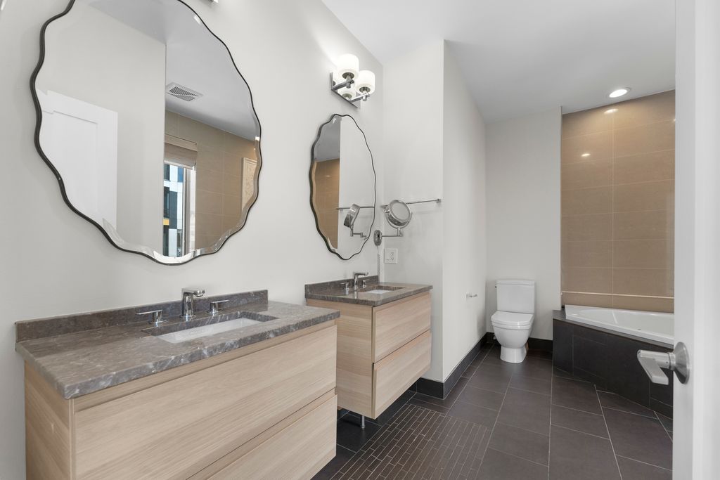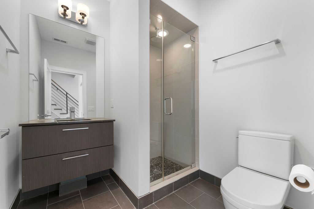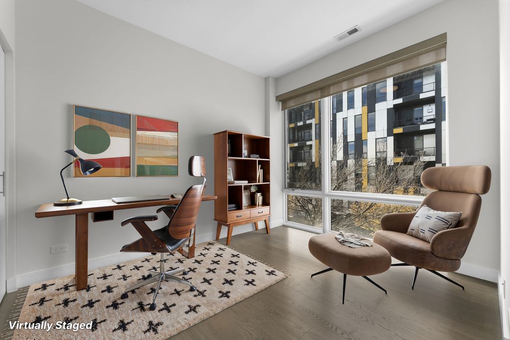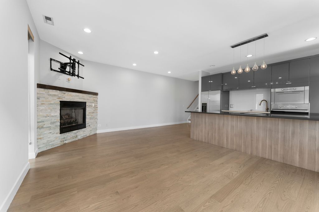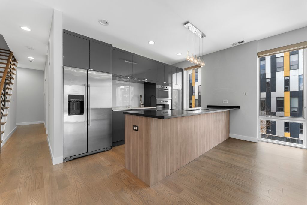 Step into sunlight and style in this stunning corner duplex penthouse. Soaring windows flood every room with natural light, while an elegant granite-and-stainless kitchen and cozy slate fireplace set the stage for effortless living. Upstairs, unwind in the luxurious primary suite with a whirlpool tub and dual vanity, alongside a spacious second en suite bedroom. The main level features a third bedroom and full bath-perfect for guests or a home office. Private rooftop access reveals sweeping skyline views, ideal for entertaining or relaxing. Just steps from The 606, great dining, and local favorites. Garage parking included.