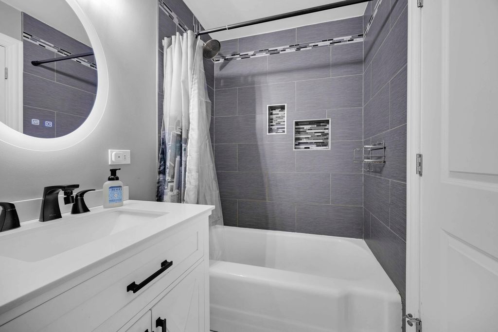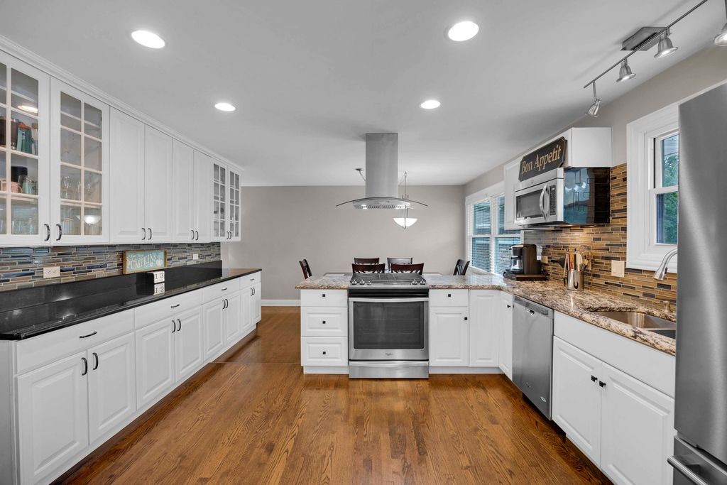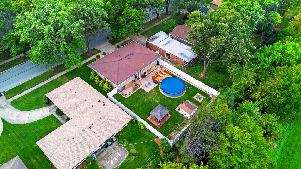 Beautiful and updated spacious raised ranch backing up to the open fields of Oak Forest High School! Expanded kitchen with granite countertops. Hardwood floors throughout the main level. Large living room with a custom built entertainment center. Modern bathrooms. Primary bedroom is extra-large for the area and has dual closets. The dramatic light-filled stairway leads to a lower level featuring a stone fireplace and wet bar. Private fenced backyard featuring a pool and numerous entertaining spaces. All NEW since 2022: Roof, vinyl fence, pool deck & paver patio, water heater, ejector pump, fridge, oven range, washer, dryer. HVAC 2020. Envision yourself in modern comfort and a backyard built for unwinding and entertaining - Book your tour today!