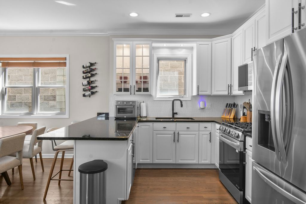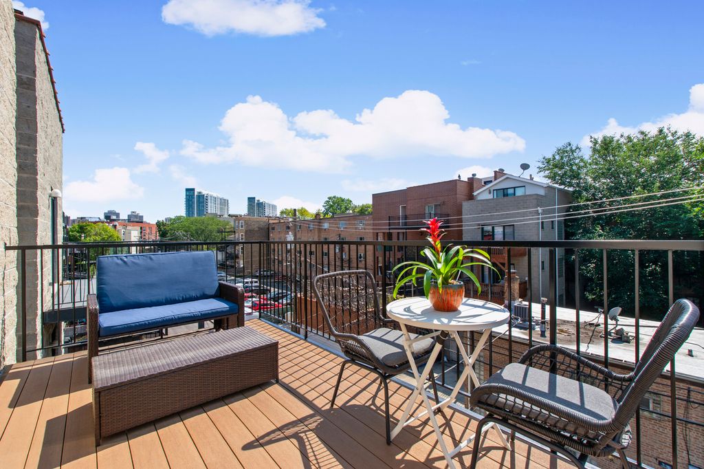 This exquisite, rarely available penthouse sits on one of the most desirable streets in Lincoln Park, offering a fully updated, sun-filled top-floor retreat. Every detail has been thoughtfully considered to create a home that blends elegance with modern convenience. A private staircase entry opens into an expansive, extra-wide living area highlighted by crown molding and a beautifully resurfaced gas fireplace, the centerpiece of the room. The open layout flows seamlessly into a dining space accented with designer lighting and warm, inviting fixtures throughout. The chef's kitchen shines with all new appliances, freshly painted cabinetry, designer hardware, and a custom backsplash. The newly added pantry and marble bar with built in wine fridge make this kitchen ideal for everyday living and entertaining. The spacious second bedroom features a new custom closet and is adjacent to a fully renovated bathroom with a new shower, vanity, updated plumbing, and modern fixtures. The hallway houses a new water heater, furnace, and top of the line washer and dryer for peace of mind. The light filled primary suite boasts its own large private terrace with new Trex decking and a built out closet. The all new spa inspired bathroom includes a soaking tub, marble walk-in shower, and custom double vanity with striking designer finishes. Upstairs your private rooftop oasis awaits - complete with an adjustable pergola and panoramic city views on a clear day. Ample storage and an attached garage add to the convenience. Set on a serene, tree-lined street just steps from neighborhood dining, shopping and transit, this home offers the perfect blend of tranquility and vibrant city living. Don't miss this rare Lincoln Park gem.