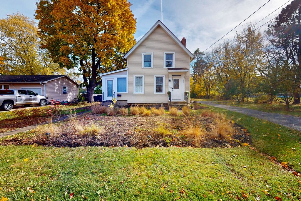HUGH 1/2 ACRE IN TOWN LOT Incredible potential, incredible opportunity, in this Home or both Business Bring your modern farmhouse ideas to this 3 bedroom, 2 bath home with 1/2 acre in town lot!! Plus a large 2 car garage with plenty of room for your tools, truck and toys. Business possibilities due to location!! Long driveway with a parking pad too! Roof 2020 and furnace and air 2021. Did I mention the 1/2 acre along with natural plantings through out for pollinators to do their thing! Also a Fenced food garden for those fresh season veggies and fruit. A big plus with todays food cost. Open kitchen with ample cabinets and counter space. Stunning exposed beams in the family room with a cozy fireplace. First floor primary bedroom with full bath just across the way. Light filled sun-room just waiting for your inspiration! Soak up that fresh air while relaxing on the lovely patio. This home is conveniently located near shopping, restaurants and with beach rights both at main lake and Three Oaks! BEING SOLD AS IS.