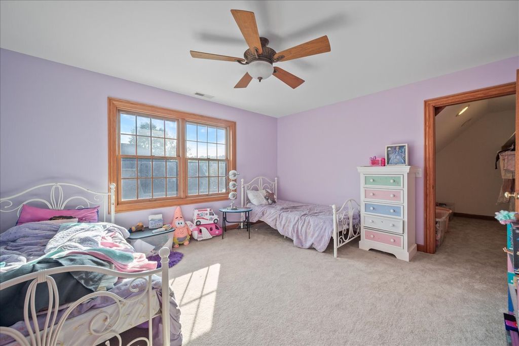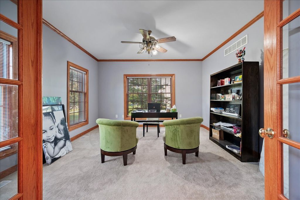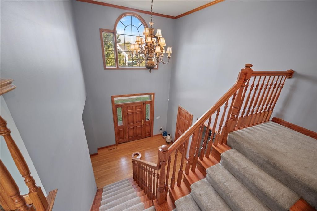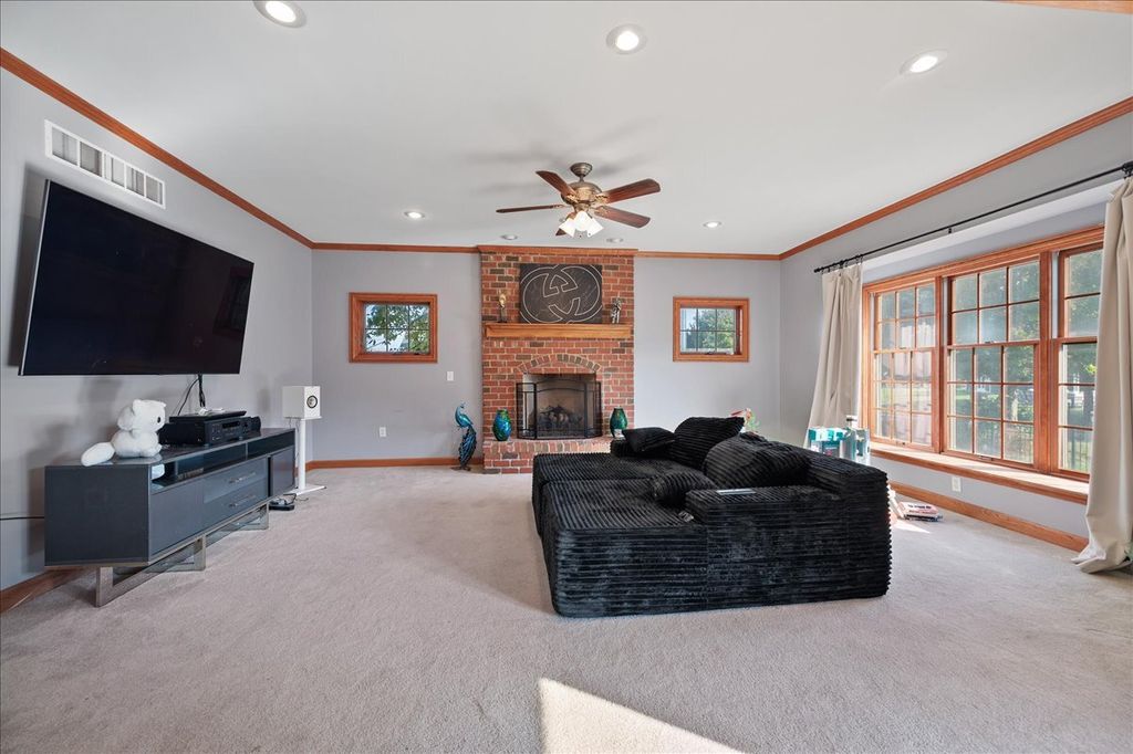 Beautiful custom-built brick Georgian home in desirable Heartland Circle! Gleaming oak hardwood floors greet you in the light filled 2-story foyer and flow through to the formal dining room, kitchen, and eating area. Main floor Living Room/Den with French doors, crown molding and closet. The formal dining room has a big bay window, crown molding and adjacent Butler's pantry. You will love the oversized kitchen with custom cabinetry that includes a buffet area with glass front cabinets, island with a 'prep' sink, solid surface countertops, SS appliances, crown molding, recessed lighting and big eating space with an atrium door to the patio and fenced yard. The cozy family room has a floor-to-ceiling brick fireplace, box bay window, crown molding, and recessed lighting. Main floor laundry/mud room with access door to garage and yard. Main bedroom suite offers a tray ceiling, walk-in closet with built-in organizer and luxury bath with dual sink vanity with make-up area, whirlpool tub, and separate shower. Three secondary bedrooms all with walk-in closets. Full hall bath with dual sink vanity and private shower/tub & commode. Full basement with abundant storage. Wrought iron fenced back yard with patio. 3 car side load heated/cooled garage. Convenient location is only a block from neighborhood park and just a few more to the Fox River! Rte 47 and 34 are close by too!