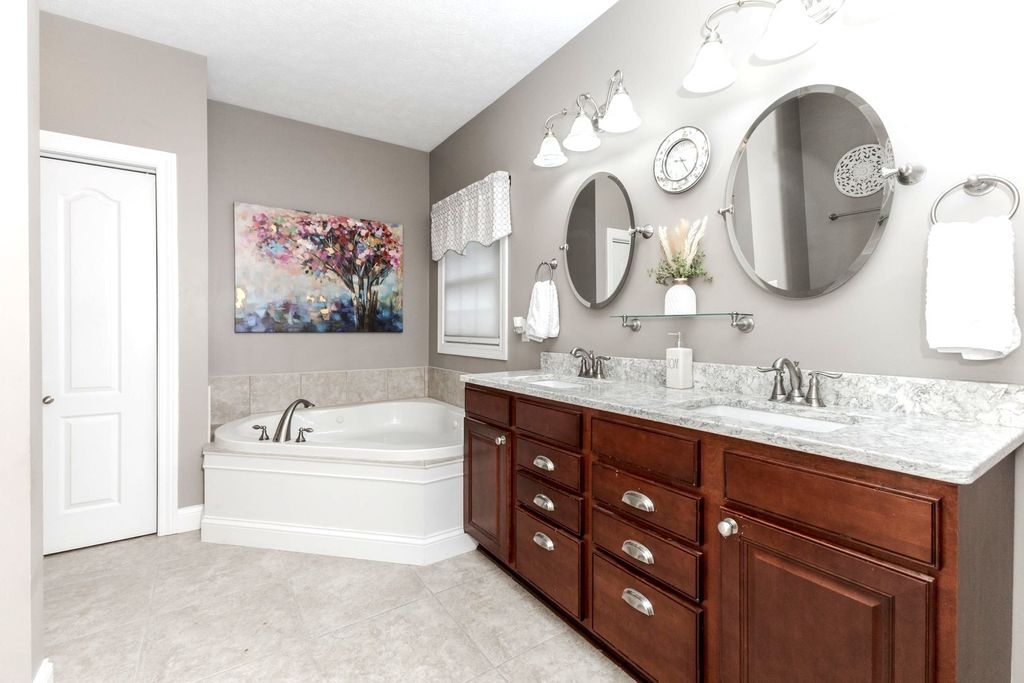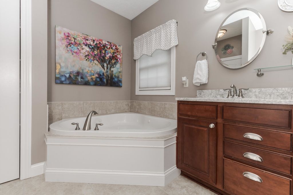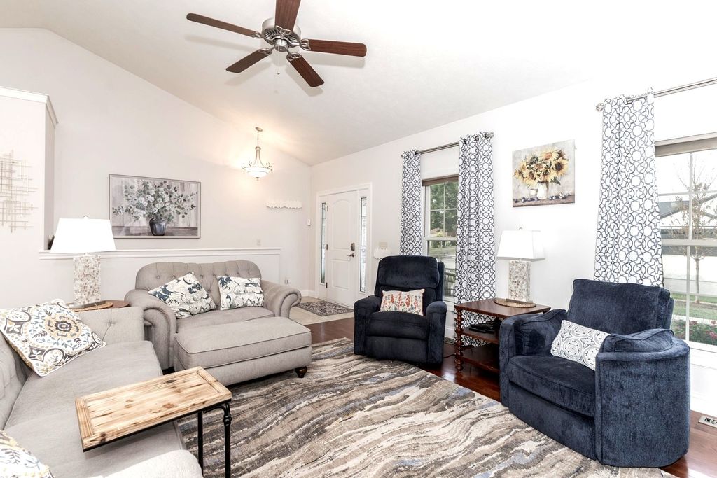 Beautiful 4 BR, 3 bath RANCH located on large corner lot in Fox Creek. Wonderful layout includes split bedroom design. Enter into an open floor plan w/ cathedral ceiling & cherry hardwood flooring. Eat-in kitchen w/ large island updated in 2023 includes new quartz countertops, tile backsplash, faucet, sink, & garbage disposal. Induction GE high profile range & high-end Bosch dishwasher new Sept 2025. Master suite includes cathedral ceiling, walk-out to covered patio, 14'x6' walk-in closet, double vanity, whirlpool tub, & shower w/ tile surround. Master bath updated 2023 includes new quartz counter tops, sinks, & faucets. Hall bath also updated 2023 w/ new quartz countertop, sink, toilet, mirror, & light fixture. Many windows throughout allow for good natural lighting. Updated basement includes family rm w/ gas fireplace, 4th bedroom, 3rd full bath, & lg storage area. 2023 basement updates include gorgeous vinyl plank flooring, new paint, & fireplace tile surround. Basement bathroom also updated in 2023. New hot water heater 2025. Covered front & back patios. Huge, fenced yard w/ new vinyl fence installed by SK Fencing in 2022. MAJOR landscaping update by Bellas includes 3 new trees, all new landscaping front & roadside, front brick wall, & new mailbox / post (September 2025). This house is handicap accessible w/ main level laundry room.