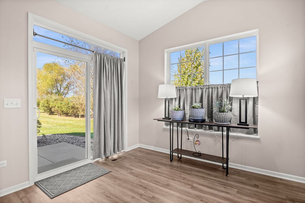 Set on a landscaped cul-de-sac lot in Huntley's sought-after Andare at Talamore 55+ community, this Bennett II ranch offers comfort, style, and convenience. Inside, you'll find 3 bedrooms, 2 full baths, and luxury vinyl plank flooring throughout. The open layout includes a family room, dining area, home office, and a vaulted sunroom with a slider leading to the backyard patio. The eat-in kitchen features white shaker cabinets, quartz countertops, an island with breakfast bar, recessed lighting, and stainless steel GE appliances. The spacious primary suite includes a tray ceiling and private bath with a double bowl vanity and walk-in shower. A partially finished deep-pour basement with epoxy flooring provides extra space and storage. Enjoy community amenities including a clubhouse, pool, tennis courts, and more-all with easy access to I-90.