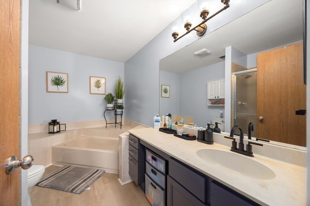 Beautifully Updated End-Unit Townhouse. Spacious one-level, second-floor end-unit townhouse with abundant natural light and vaulted ceilings. Features 3 bedrooms, 2 bathrooms, and a one-car garage. The open-concept living area includes a cozy fireplace, private balcony, and an eat-in kitchen with new stainless steel appliances (2022), refaced cabinets (2022), quartz countertops (2025), undermount sink, and pullout faucet (2025). Primary suite offers an ensuite bath with separate shower and soaking tub. Additional highlights include washer and dryer (2023), new water heater (2022), new HVAC system (2024), luxury vinyl flooring (2025) and a dedicated laundry room. Move-in ready with modern updates throughout - a bright and inviting home in a desirable location!