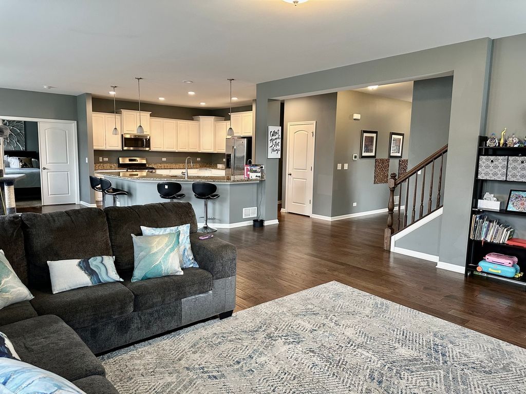 Welcome to The Estates of Lions Chase! This stunning home offers over 4,600 sq ft of living space with 5 bedrooms and 3 1/2 baths. Step up to the massive, inviting front porch and into a home that blends elegance with everyday comfort. Hardwood floors lead you through the main level, starting with a powder room and flex room perfect for a den, formal living or formal dining room. The spacious great room is open to the kitchen and eating area - ideal for entertaining. The kitchen features white cabinets of varying heights and decorative trim, granite countertops, stainless steel appliances (new microwave and dishwasher in 2024), a center island with breakfast bar, and a large eating area. Off the kitchen, you'll find a designated mudroom for daily convenience. The first floor primary suite includes a butler's pantry perfect for a coffee station, walk-in closet & ensuite private bath. Upstairs, a loft area anchors four additional bedrooms including the 2nd floor primary suite with a walk-in closet and luxurious bath featuring a tall double vanity and oversized walk-in shower with tile surround and bench. The second floor laundry and additional full bath with double vanity complete the second level. The finished basement adds even more living space with a playroom, recreation room and plenty of storage. Major updates in 2024 include a new furnace, A/C, sump pump, water heater & fresh interior paint throughout. The home also features a painted 3-car garage. Award winning Huntley Schools & located adjacent to the Huntley Park District, Stingray Bay Water Park, playgrounds, fishing ponds and sports fields, this neighborhood offers direct path to these amenities - plus it's just a 5 minute drive to I-90 for easy commuting! This is THE ONE!