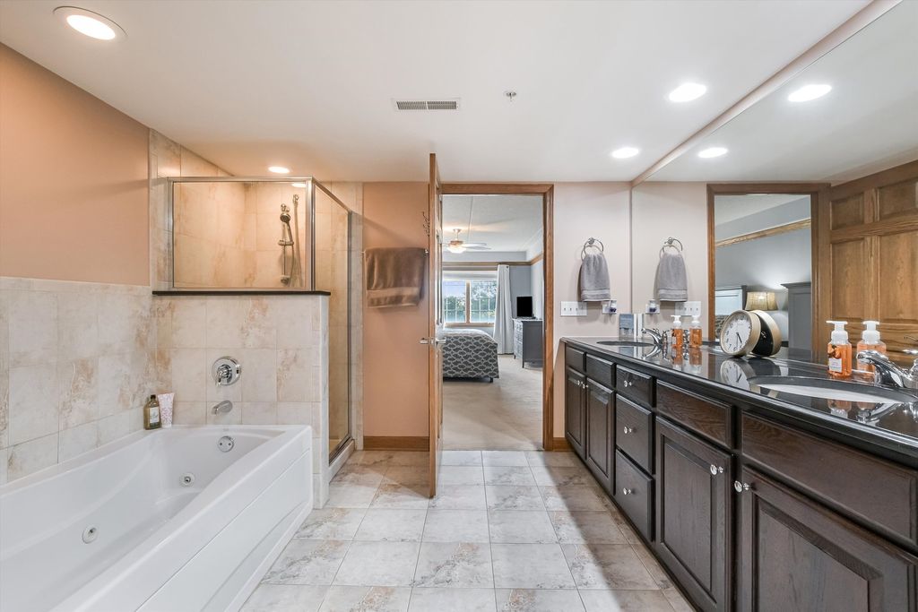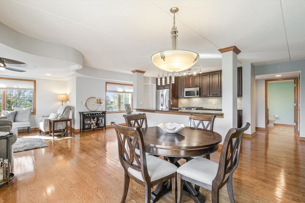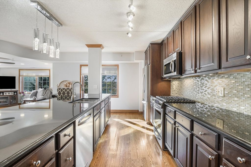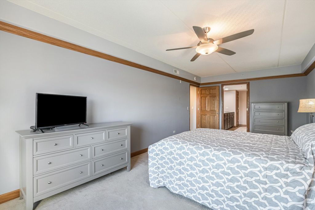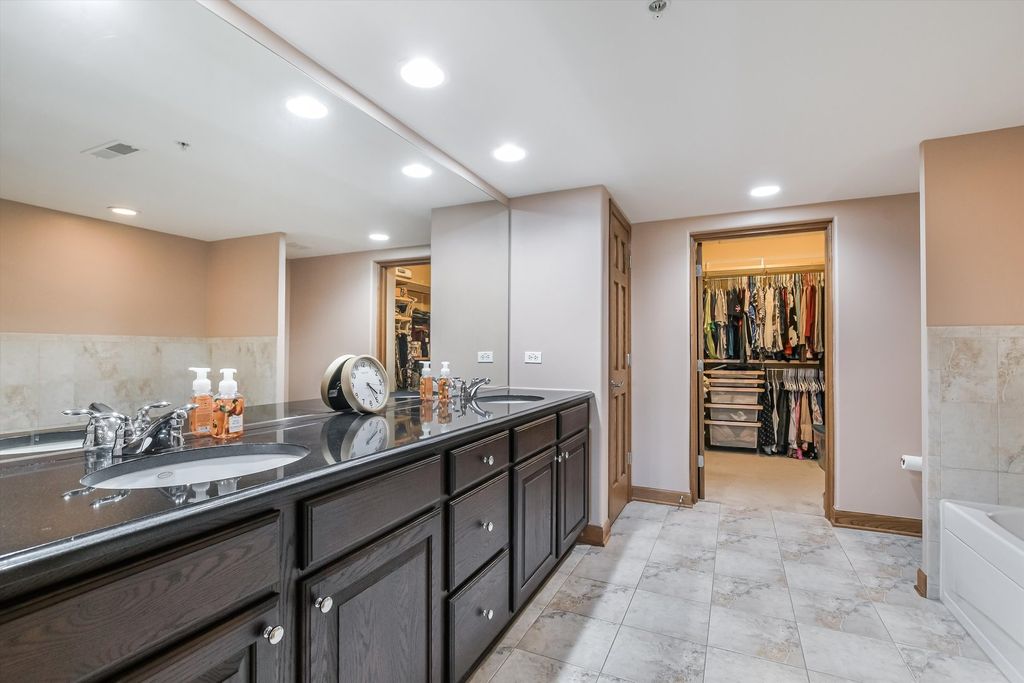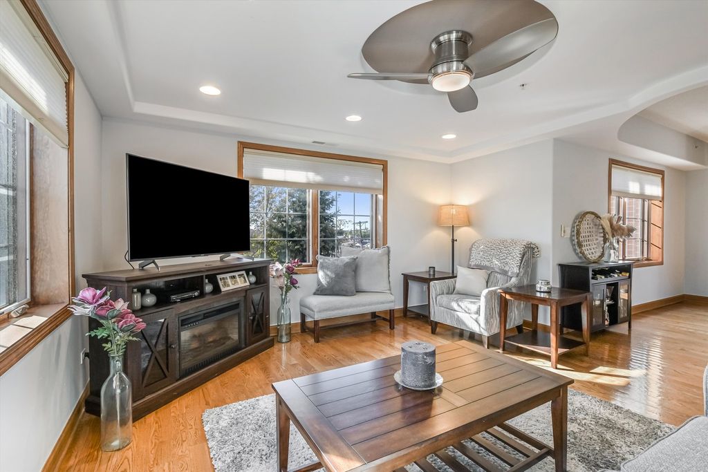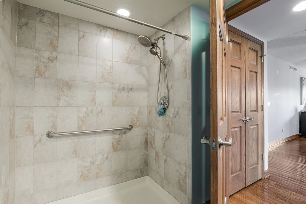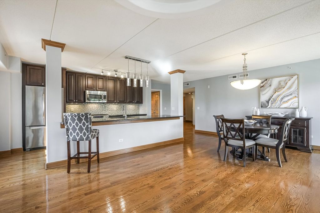 Step inside this stunning top-floor residence at Clock Tower Pointe, where sunlight fills every corner of this spacious three-bedroom, three-bath end unit. With its southern exposure and two private balconies, the home feels bright and inviting. The eat-in kitchen features sleek stainless-steel appliances and plenty of space for cooking, entertaining, or enjoying your morning coffee. The hardwood floors lead you to the cozy living room with windows on every wall and an entrance to your first balcony. The primary suite offers a serene retreat with a spa-like bath complete with a jetted tub, separate shower, and double sinks. The large walk-in closet is professionally designed and organized. The second bedroom features your second balcony, and the third bedroom has ample closet space. Additional conveniences include in-unit laundry with a full-size washer and dryer, radiant heated floors, and central air. The heated garage space (#2-7) with its own storage unit adds ease. Residents here enjoy a true lock-and-leave lifestyle-assessments cover gas, heat, water, cable, internet, and access to the on-site fitness facility. Perfectly located with quick access to expressways, public transportation, and O'Hare Airport, you're steps from Mariano's and Portillo's, and just minutes from the HIP Mall. Situated within the sought-after Pennoyer and Maine South High School districts, this home blends luxury, convenience, and community in one exceptional package.