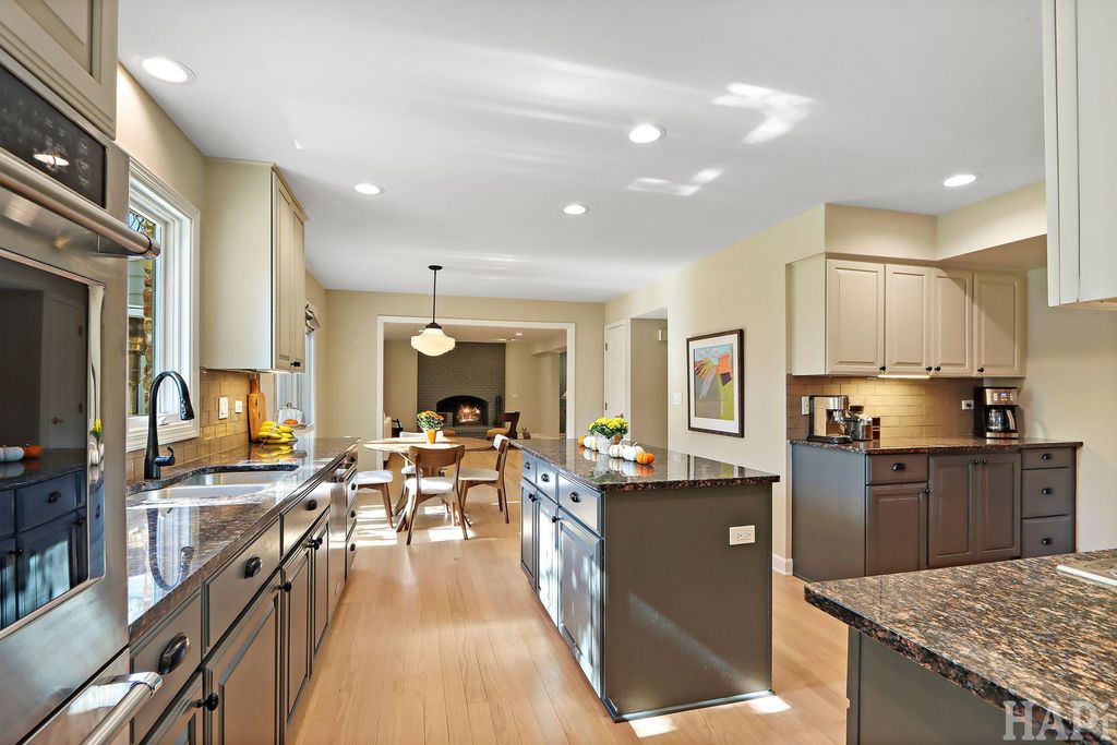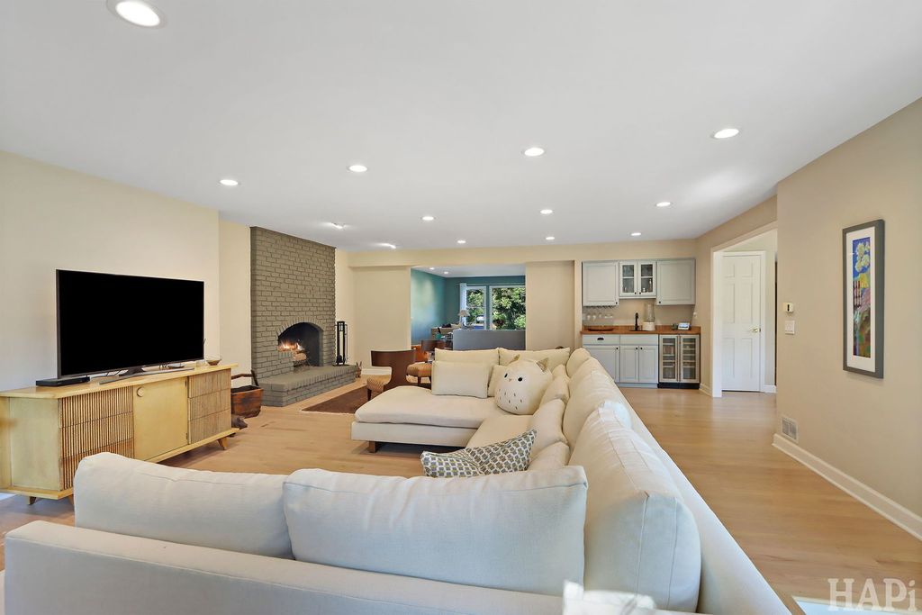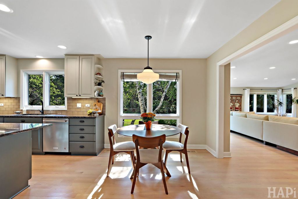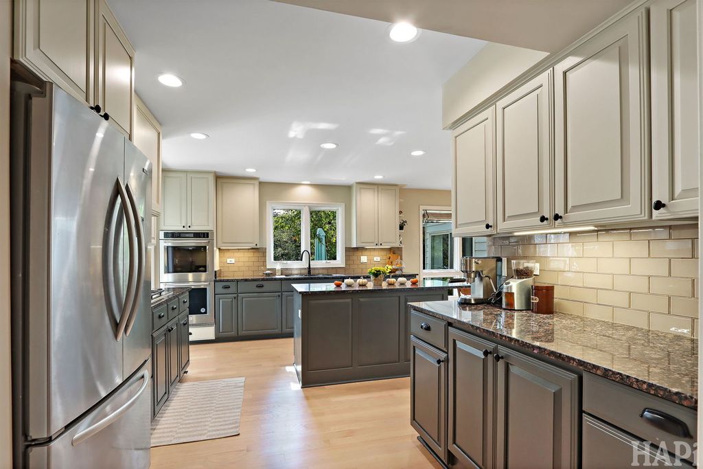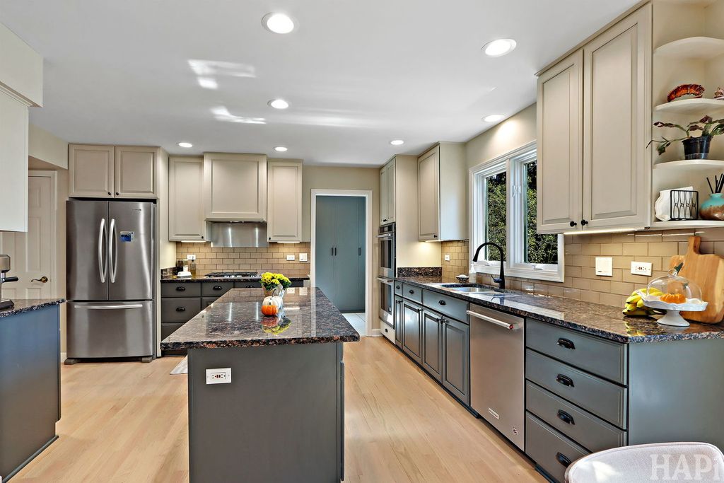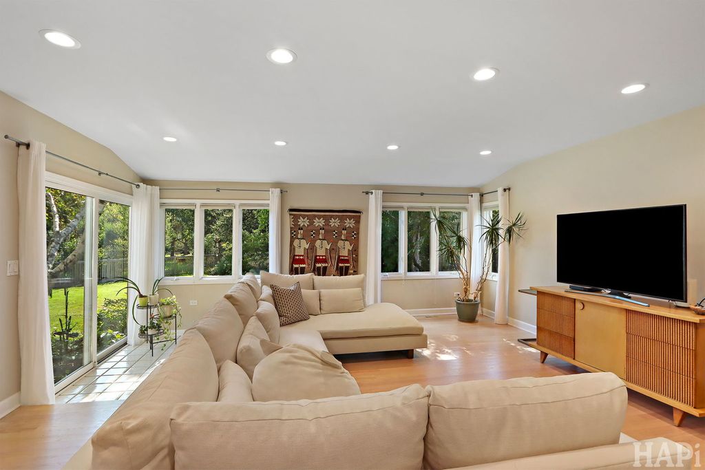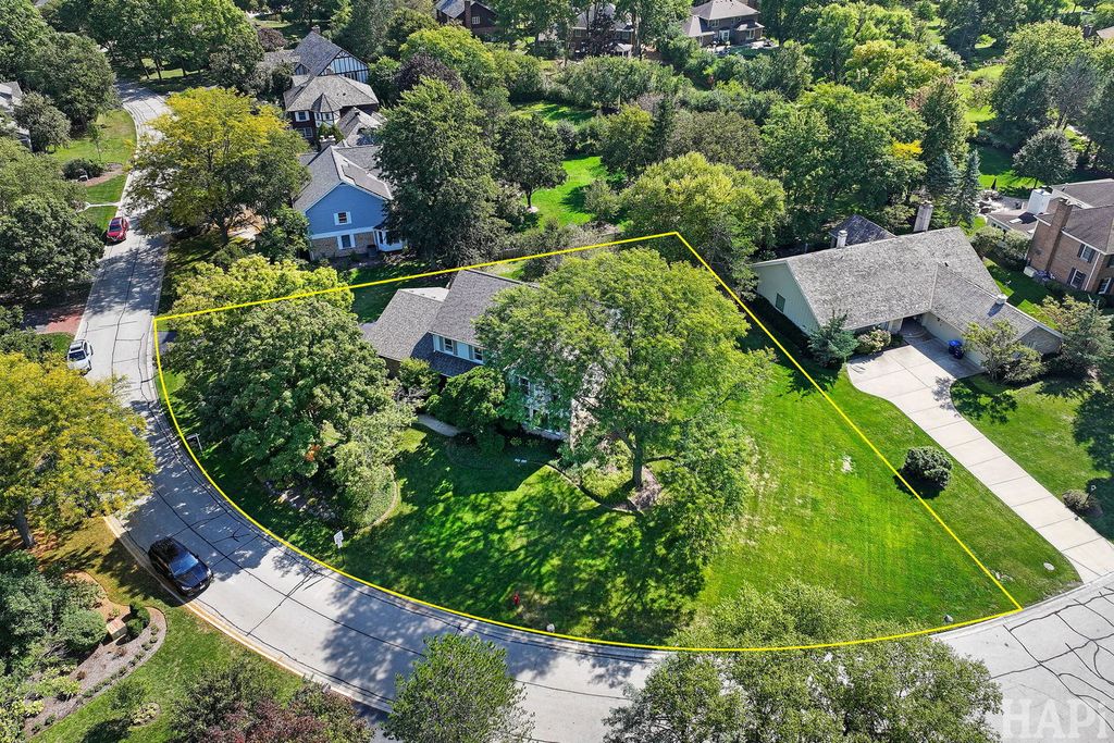 Located in one of Lincolnshire's most desirable neighborhoods and the award-winning D103 and Stevenson school districts, this beautifully updated home sits on over a half-acre of professionally landscaped grounds with mature trees. A new cedar fence encloses part of the backyard, while a poured pebbled patio offers peaceful landscape views and an expansive side yard to the south. The welcoming front porch leads to an interior with new hardwood floors, fresh modern paint, and recessed lighting throughout the home. The open foyer flows to a formal dining room and sun-filled living room with a new picture window. The family room connects seamlessly to the kitchen and living areas, anchored by a floor-to-ceiling brick fireplace with new gas logs. An addition at the back brings even more light and living space, along with a full wet bar featuring a beverage cooler and cherrywood countertop. The kitchen offers stainless steel appliances, granite counters, and a bright dining area overlooking the backyard. Updates include a redesigned powder room (2024) and a new laundry room with dog bath, second refrigerator, and ample storage. The mudroom features floor-to-ceiling storage and access to the epoxy-coated garage. Upstairs, four generous bedrooms share a full bath with double sinks. The primary suite includes a large custom walk-in closet and a spa-like bath with dual vanity, glass shower, and soaking tub. The finished basement adds luxury vinyl flooring, recessed lighting, and abundant storage. Major improvements include a new roof (2025), HVAC systems (2024), sump pumps (2023), gas fireplace (2025), plus a Generac generator for nearly whole-home backup. Close to Old Mill Park, Whytegate Park, North Park, and local bike trails, this home blends comfort, style, and unbeatable location.