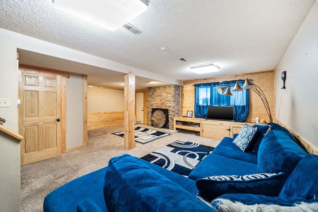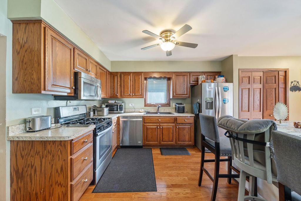 This beautifully maintained split-level home with a finished sub-basement offers the perfect blend of comfort, space, and style. Step inside to an inviting open-concept main level featuring hardwood floors throughout the kitchen, dinette, and living room. The upgraded Tri-Star solid oak cabinetry, HUGE center island, and Whirlpool stainless steel appliances make this kitchen a true showstopper-ideal for entertaining or everyday living. Head down to the cozy family room, where warm wood accents and a stone, wood-burning fireplace create the perfect atmosphere for chilly fall and winter evenings. This level also includes a convenient office area and a second full bathroom, offering flexibility for work or guests. Upstairs, you'll find three spacious bedrooms, each with ceiling fans and hardwood floors. The full bath on this level offers ample closet storage, and the contemporary glass storage cabinets in the hallway are included! The finished sub-basement provides even more living space with a large rec room and laundry area. Additional features include Pella windows with between-the-glass blinds, offering both energy efficiency and style. Enjoy outdoor living in your fully fenced backyard, featuring a HUGE extended concrete patio, hot tub (included!), and fresh landscaping along the perimeter. The yard backs up to open green space, providing extra privacy and a peaceful view. One of the home's true highlights is the massive 24x36 garage, complete with upgraded electrical, a man-cave bar area, and a separate workshop/storage space with its own door. The garage cabinets stay, making this space as functional as it is impressive.