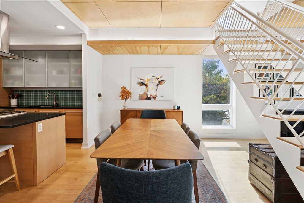 Truly one-of-a-kind! Discover this incredibly unique and architecturally striking 2 bed + den / 2 bath duplex perfectly situated in the heart of Bucktown. Flooded with natural light from dramatic floor-to-ceiling corner windows, this modern home combines sleek design with warm, inviting details-like light hardwood floors throughout and beautiful birch panel ceilings that make every space feel special. The chef's kitchen is a showstopper with SubZero, Bosch and KitchenAid appliances, honed granite countertops, and custom Italian cabinetry, all opening to a spacious dining area perfect for entertaining. A statement staircase leads to the expansive living room, anchored by a cozy gas fireplace and French doors that open to your massive private terrace-an entertainer's dream and an outdoor oasis you won't find anywhere else! Retreat to your sun-drenched primary suite featuring abundant closet space and a spa-inspired bath with dual vanities and a separate soaking tub and shower. Upstairs, you'll find a generous second bedroom, full bath, and a versatile den or home office-ideal for today's lifestyle. One garage parking space and storage unit included. All this in an unbeatable location-just steps from Damen Avenue's boutique shopping and top-rated restaurants, a short stroll to North Avenue, The 606 trail, and easy access to the Blue Line, Metra, and expressway.